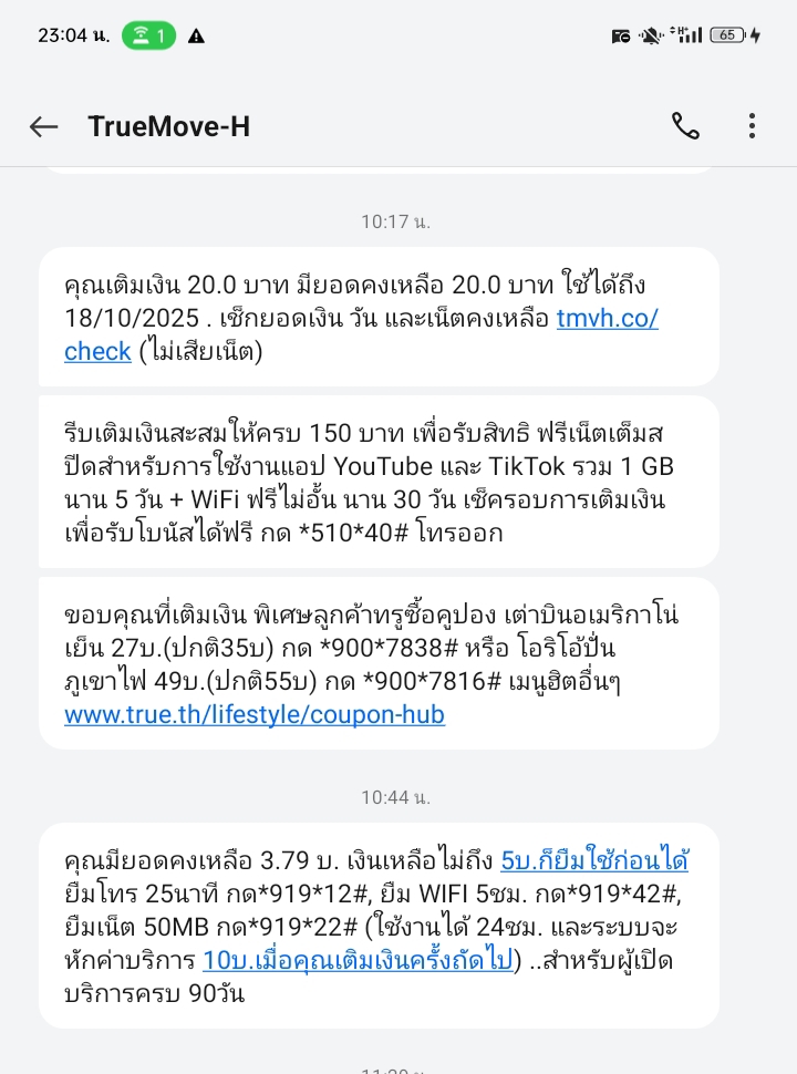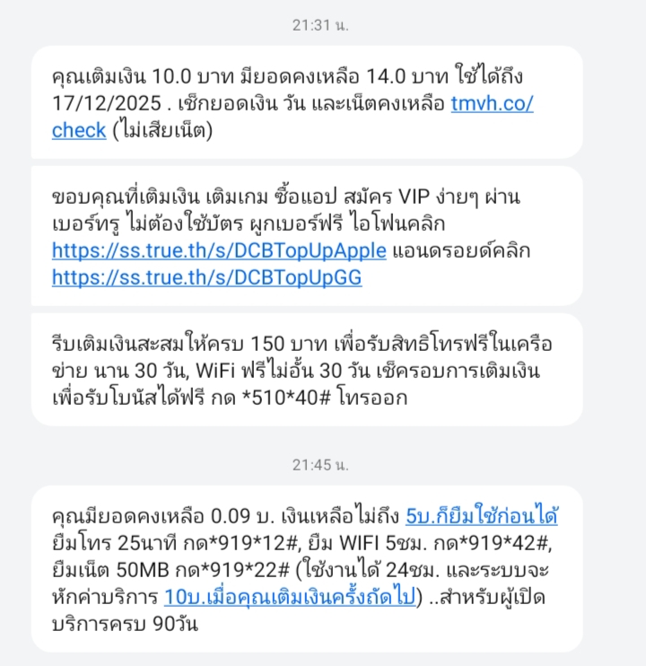 ใช้ทรูมูฟเอชแบบเติมเงิน แพ็คเกจเน็ต 10GB 30 วัน+คูปองส่วนลด McDonald 200 บาท ต่ออายุอัตโนมัติ ใช้งานได้ถึง 28/11/2568 23:59:59 มีเงินเหลืออยู่เกือบ 50 บาท หลังเที่ยงคืนวันที่ 13/11/2568่ ใช้เน็ตถึงเที