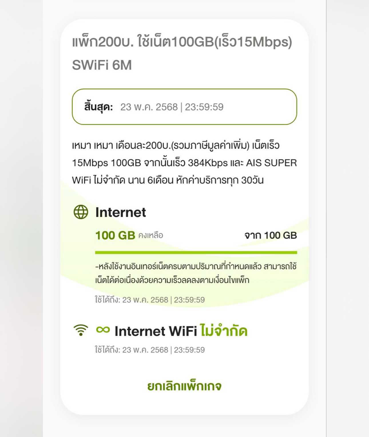 อยากใช้โปรเดิม โปรโมชั่นของคุณในปีแรกนับจากวันที่เปิดเบอร์คือ เน็ตพร้อมใช้ความเร็วคงที่ ได้ 100 GB/เดือน โทรไม่อั้นในเครือข่าย (ตัดสายเมื่อครบ 30 นาที) โทรนอกเครือข่าย 60 นาที/เดือน และ WiFi ฟรีไม่อั้