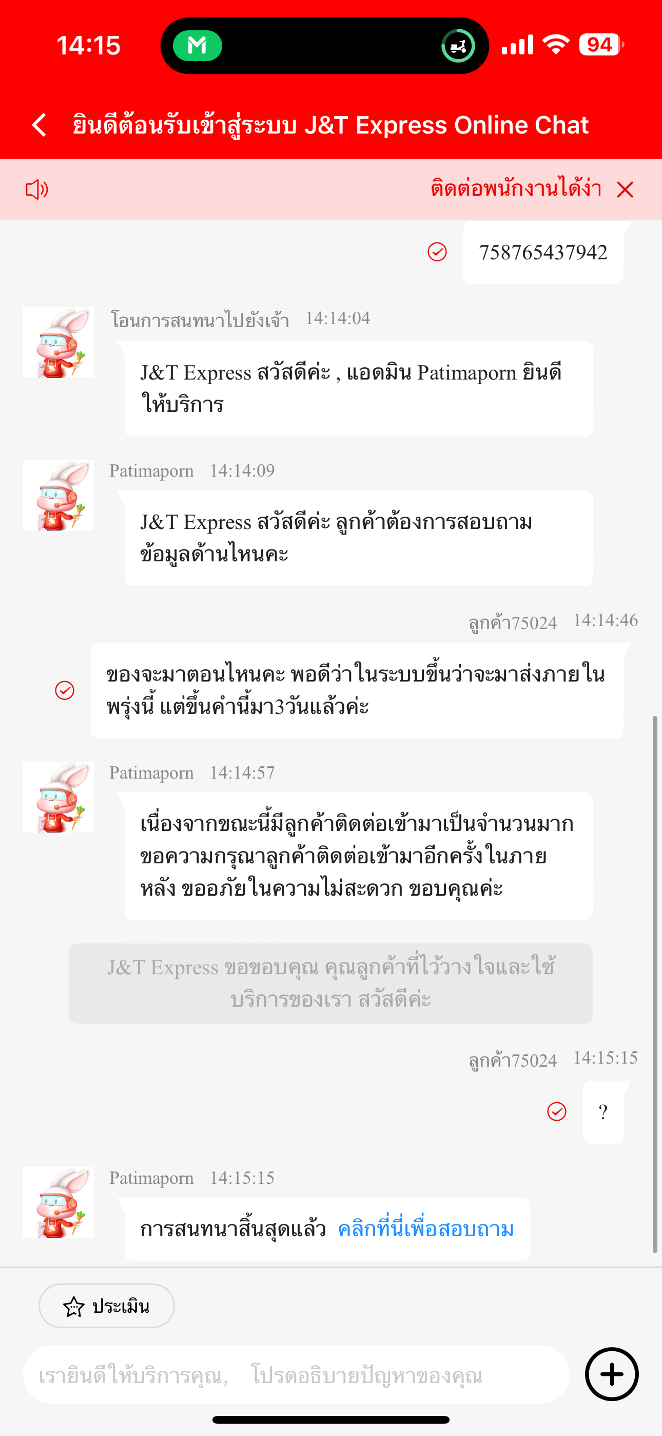 พรุ่งนี้นี่คือพรุ่งนี้ไหนคะ แล้วอันนี้คืออยากรู้มากค่ะ ขอความรู้หน่อย ปกติพนักงานj&tแถวบ้านเรามีมาส่งประมาณ4-5คนเลย แต่อยู่ๆทำไมรอบนี้พัสดุถึงได้ไปอยู่ฝั่งบ้านบึงค่ะ แล้ววันที่16ก็ขึ้นว่าจะได้รับพัสดุภายในพรุ่งนี้ ซึ่งก็ต้องเป็นวันที่17 แต่พอวันที่17ระบบไม่รัน มารันอีกทีช่วงเย็น พอมาวันนี้วันที่18ก็ขึ้นว่าจะมาพรุ่งนี้ สรุปพรุ่งนี้คือพรุ่งนี้ไหนคะ แล้วทักแชทหาแอดมิน ก็ถามว่าจะติดต่อเรื่องอะไรพอให้เหตุผลไปก็ตัดแชทจบเฉยเลย