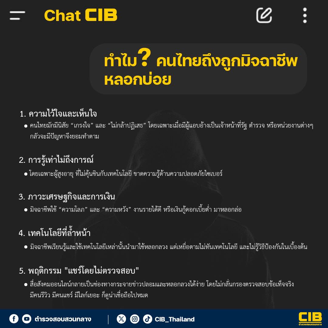 1. ความไว้ใจและเห็นใจ คนไทยมักมีนิสัย “เกรงใจ” และ “ไม่กล้าปฏิเสธ” โดยเฉพาะเมื่อมีผู้แอบอ้างเป็นเจ้าหน้าที่รัฐ ตำรวจ หรือหน่วยงานต่างๆ บางคนกลัวจะมีปัญหาจึงยอมทำตามคำสั่งแม้จะสงสัยอยู่บ้าง
