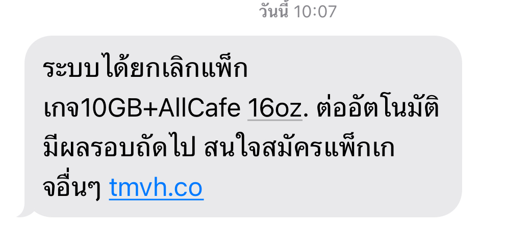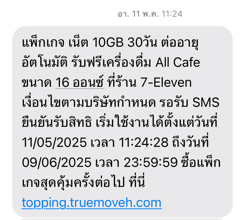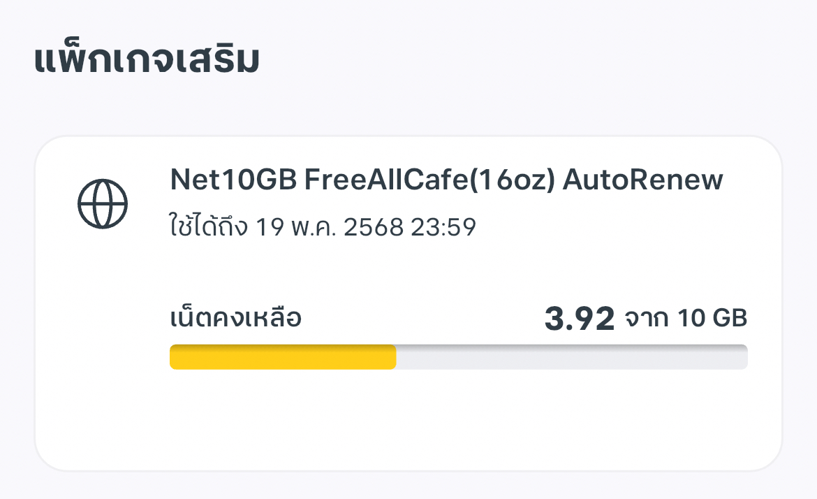แพ็กเกจเน็ต10GB+AllCafe 16oz. ต่ออายุอัตโนมัติ 210บาท(รวมภาษี) จะสิ้นสุดวันที่ 12/09/2024 เวลา 23:59 เพื่อการใช้งานต่อเนื่องและรับสิทธิพิเศษ กรุณาชำระค่าบริการภายในวันครบกำหนดชำระบิลของคุณ เดือนที่แล้