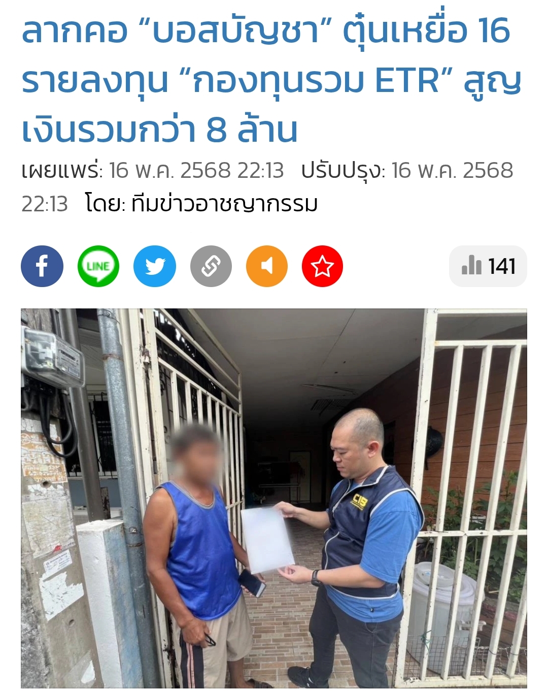 ลากคอ “บอสบัญชา” ตุ๋นเหยื่อ 16 รายลงทุน “กองทุนรวม ETR” สูญเงินรวมกว่า 8 ล้าน