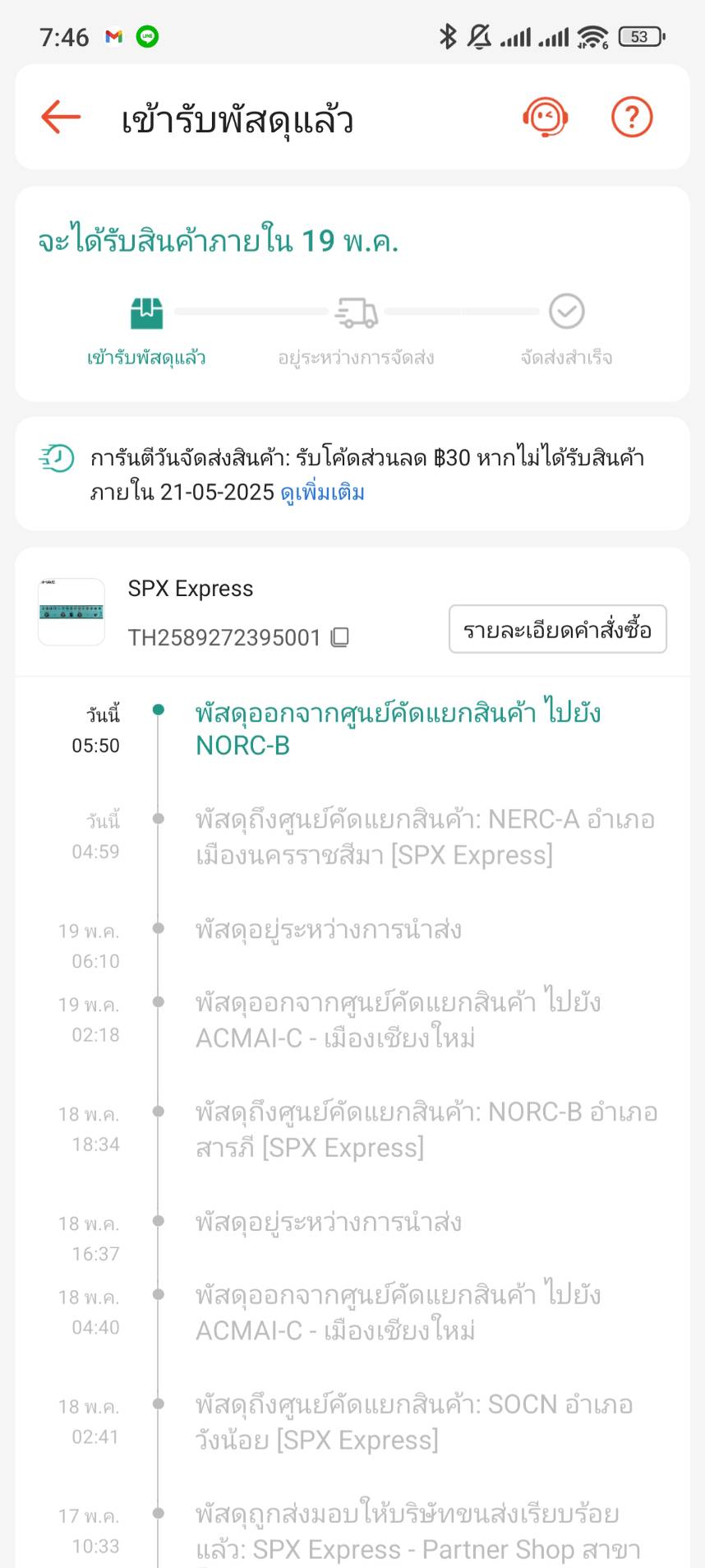 คือสั่งของจากกรุงเทพมาเชียงใหม่ครับ กำหนดส่งวันที่ 19 ตอนแรกก็ถึงศูนย์คัดแยกสารภีเชียงใหม่แล้ว ไอ่เราก็ใจชื้นคิดว่าคงได้วันนี้ ก็ไม่ได้สนใจ เพราะพี่ขนส่งรู้จักกันอยู่แล้ว เวลาของมาแกจะยิงเบอร์มา แล้วก็วางไว้ที่เดิม พอเวลาผ่านไปเลย2ทุ่มเงียบ คงคิดว่าไม่ได้หละ คงจะมาส่งวันนี้ พอเปิดมาดูวันนี้วันที่20ไปนครราชสีมาเฉย คือแบบว็อททท แล้วแบบนี้จะได้ตามกำหนดไหมครับ ที่จริงก็เลยมาแล้วแหละ ช่วงนี้ทำไมระบบแปลกๆ ปกติ spx express ส่งไวมากเลยนะ บางทีมาก่อนกำหนดอีก อย่างของผมอยู่ในตัวเมืองมาก่อนกำหนดตลอดครับ
