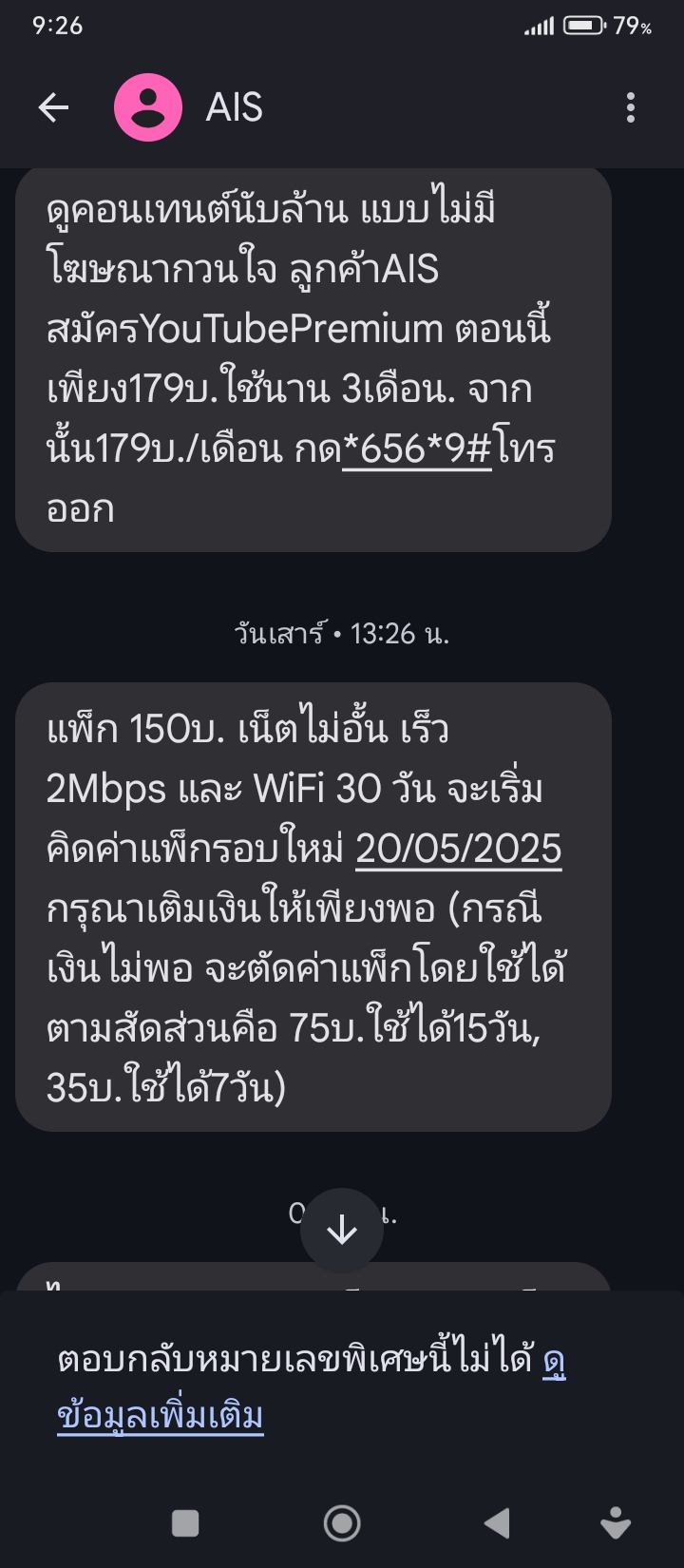 ปกติใช้ sim internet unlimited ของ AIS ต่อกับ Router internet ไว้เชื่อต่อกับกล้องกลับไว้ให้คนไกล้ๆใช้ ไม่ได้ต่อมือถือเลยไม่มี SMS เข้าเลยไม่ทราบ ตอนแรกใช้โปรของ ais net 30mbps unlimited ก็ใช้ได้ไหลลื่