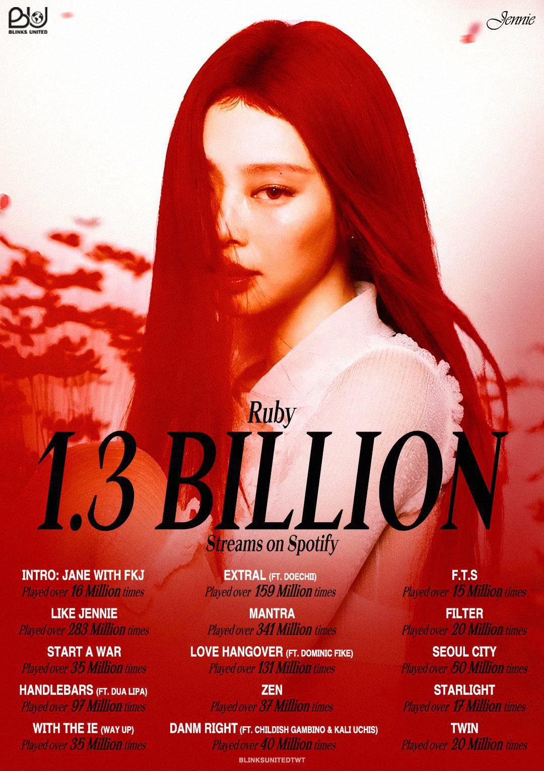 อัลบั้ม “Ruby” ของ JENNIE มียอดสตรีมบน Spotify ทะลุ 1,300 ล้านครั้ง 🎉