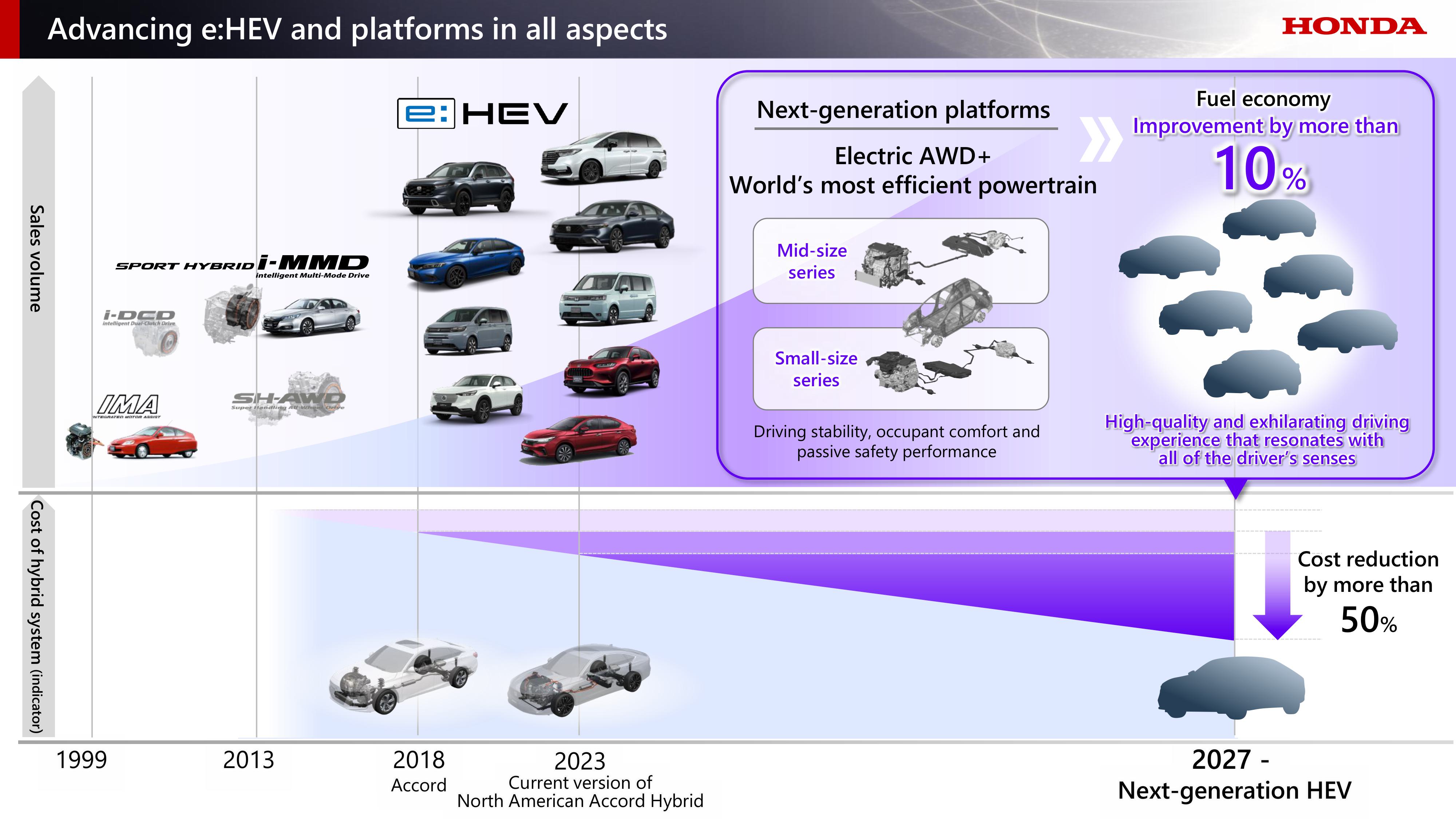 · ตั้งเป้าพัฒนาระบบขับเคลื่อนฟูลไฮบริด e:HEV เจเนอเรชันใหม่ ให้มีอัตราการสิ้นเปลืองน้ำมันที่ดีขึ้น 10% รวมถึงเพิ่มขีดความสามารถในการแข่งขันด้านต้นทุนให้กับรถไฮบริด (HEV) ของฮอนด้า และปรับต้นทุนของระบบฯ ลง 50% เมื่อเทียบกับระบบไฮบริดที่ติดตั้งในรถยนต์ที่เปิดตัวรุ่นปี 2018 และลดลงกว่า 30% เมื่อเทียบกับระบบไฮบริดที่ติดตั้งในรถยนต์ที่เปิดตัวในปี 2023 ในรุ่นปัจจุบัน