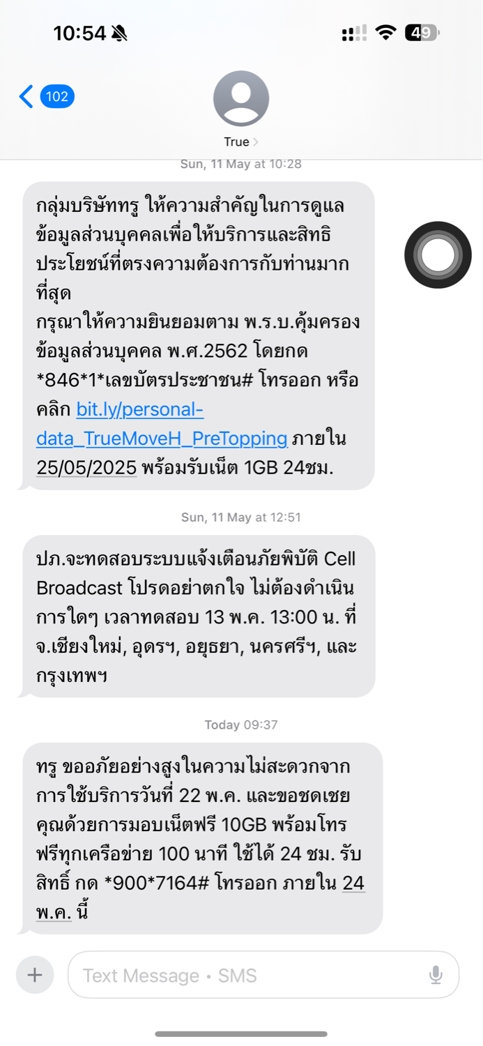 -วันที่ 22/5/68 ระบบของทรูใช้งานไม่ได้ -วันที่ 23/5/68 เวลา 8.13 น. มี sms แจ้งว่าจะชดเชยให้โดยมอบเน็ต 10GB และโทรฟรีทุกเครือข่าย 100 นาที ใช้ได้ 24 ชม รับสิทธิ์ กด *900*7164# ผมจึงกดรับสิทธิ์ แล้วไ