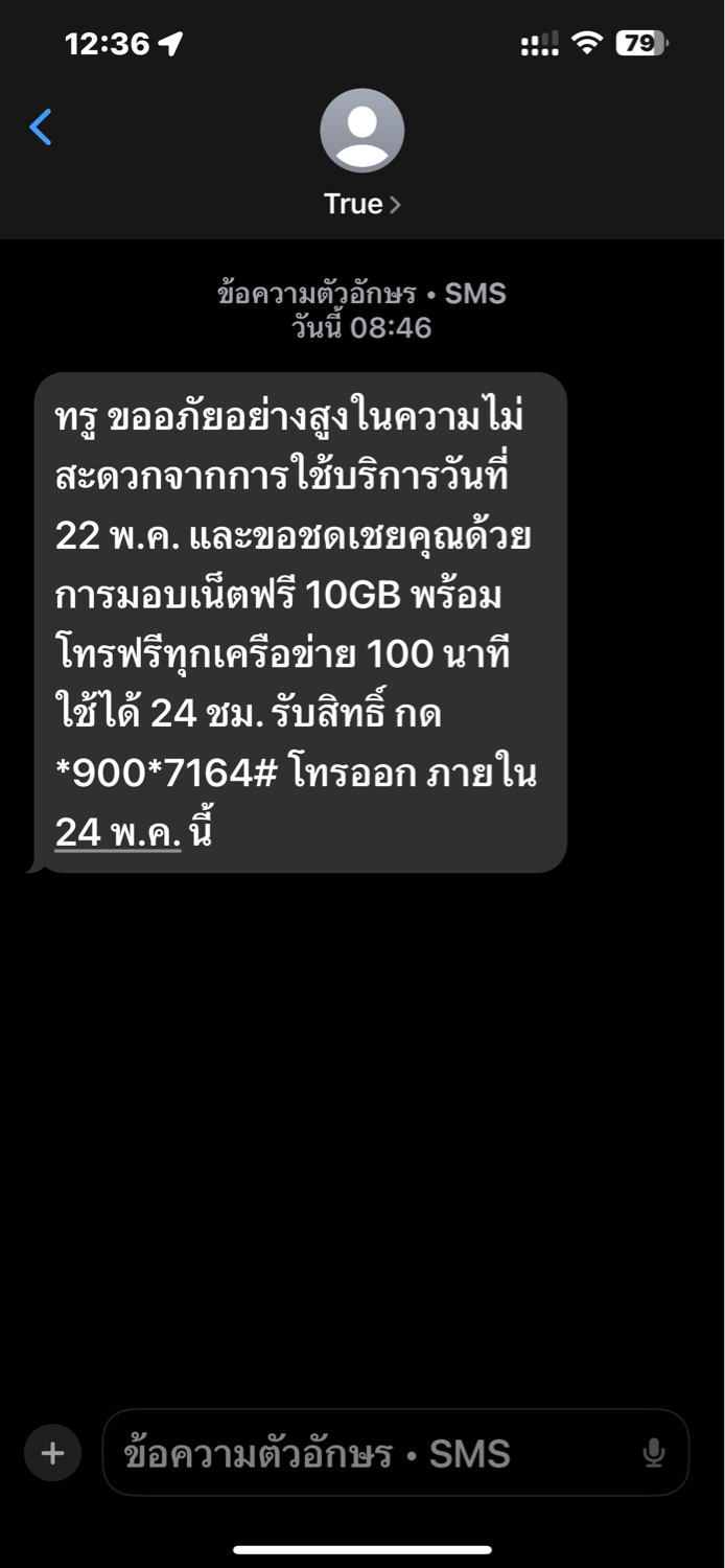 สืบเนื่องจากเครือข่ายล่มเมื่อวาน ทรู ขออภัยอย่างสูงในความไม่สะดวกจากการใช้บริการวันที่ 22 พ.ค. และขอชดเชยคุณด้วยการมอบเน็ตฟรี 10GB พร้อมโทรฟรีทุกเครือข่าย 100 นาที ใช้ได้ 24 ชม. รับสิทธิ์ กด *900*716