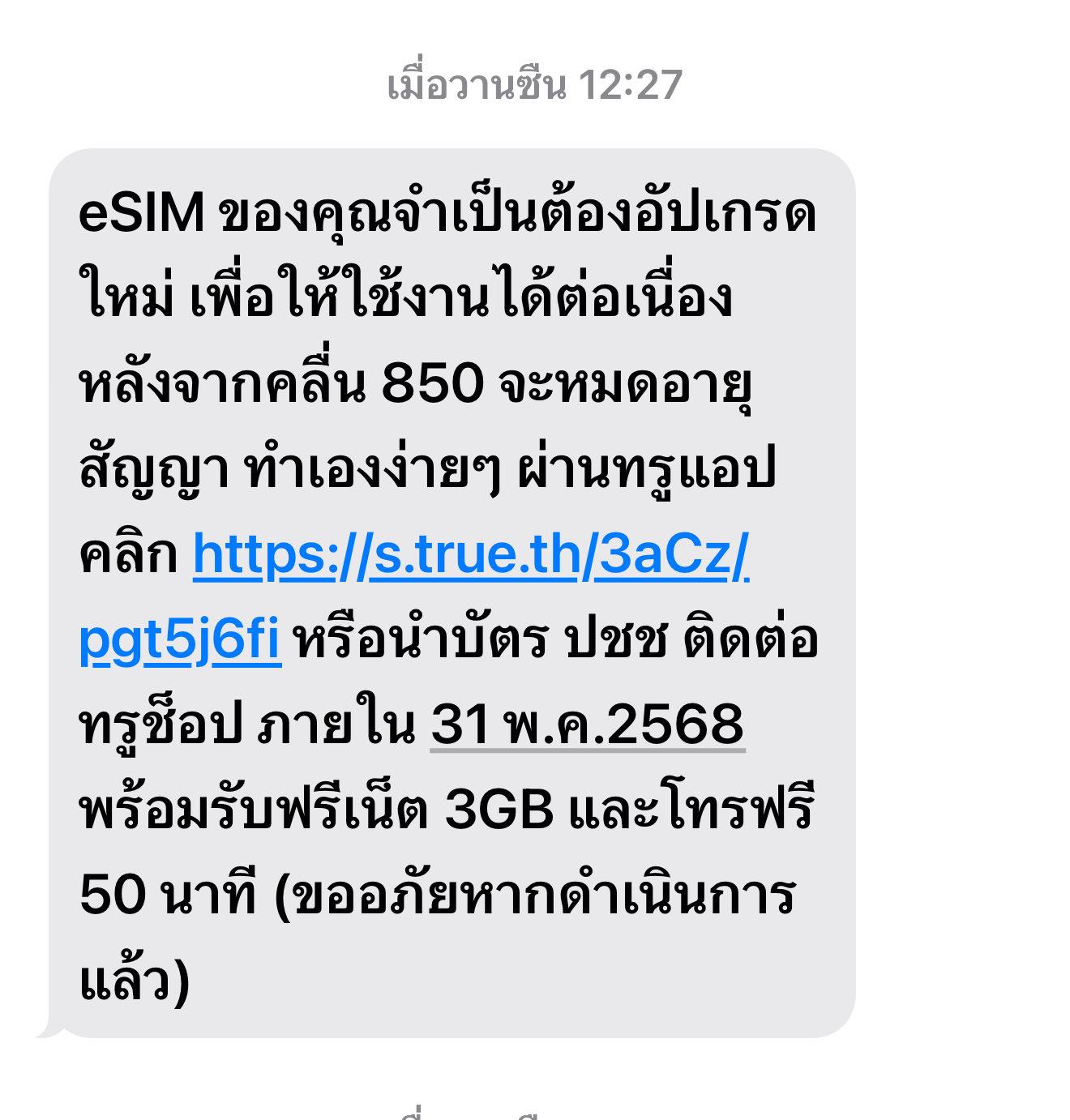 ผ่านไปไม่นานมีเบอร์จากศูนย์ 1242 โทรมาให้เราไปอัพเกรดอีซิมที่ true shop ดีที่โทรมาตอนเดินห้างพอดี เลยไปจัดการได้ พอไปถึง shop พนักงานบอกเบอร์เราไม่มีแจ้งให้อัพเกรด เราก็บอกว่าเบอร์ 1242 โทรมาแจ้ง แต่พนักงานก็ยืนยันว่าในระบบไม่แจ้งให้อัพเกรด เราก็เลยไม่ทำอะไร