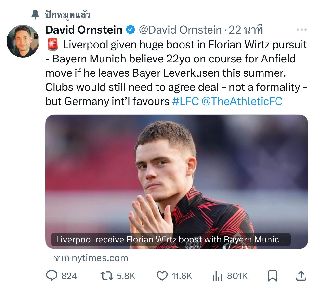 เดวิด ออนสตีน เจ้าพ่อจากเดอะ แอธเลติก รายงานว่า วงในของบาเยิร์น มิวนิค เชื่อว่าฟลอเรียน เวียร์ตช์ จะเลือกลิเวอร์พูลเป็นเป้าหมายถัดไปหากย้ายทีม มากกว่าที่จะเป็นเสือใต้