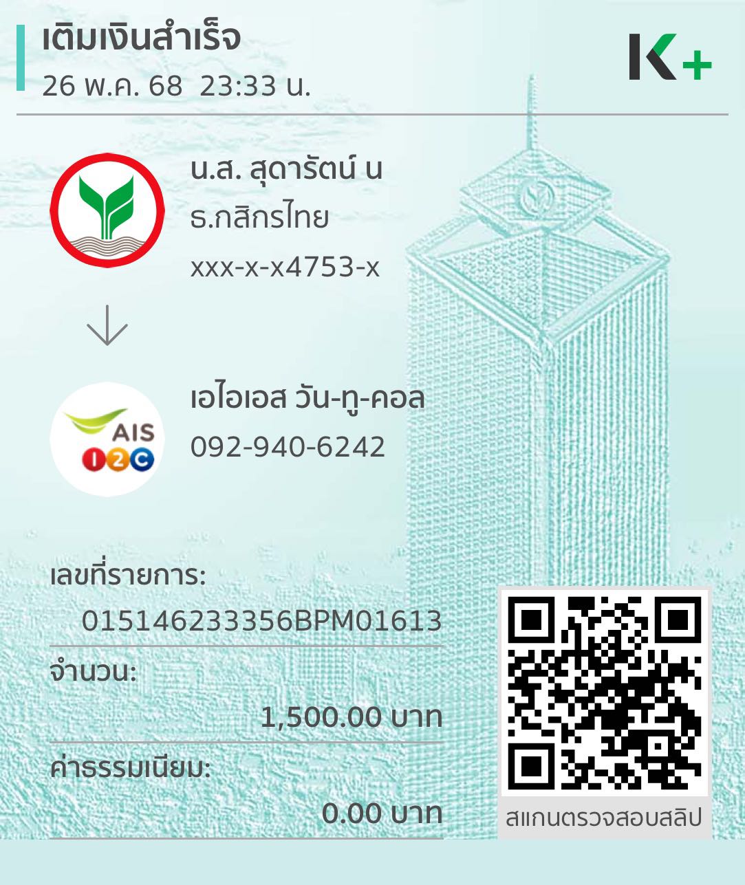 เติมเงินมือถือผ่านธนาคารสีเขียว ไปยังเบอร์ 0929xxxxx(เบอร์ผิด) จำนวน1,500บาท