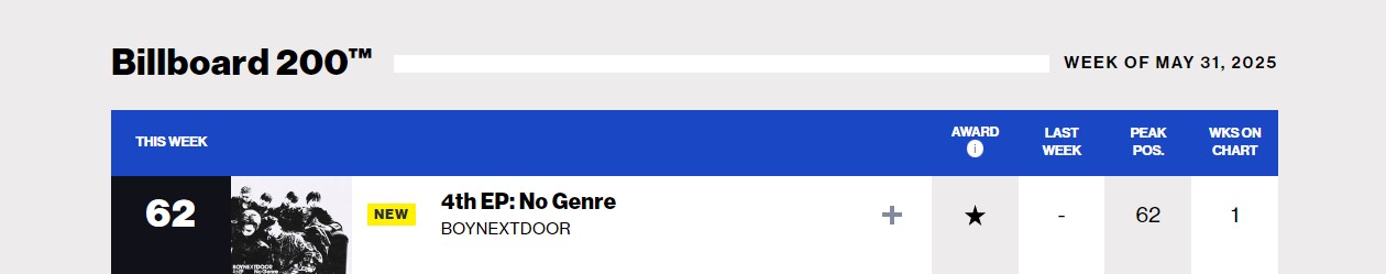 BOYNEXTDOOR, No Genre (EP). เดบิวท์ในอันดับที่ #62 บนชาร์ต Billboard 200 ประจำสัปดาห์นี้!