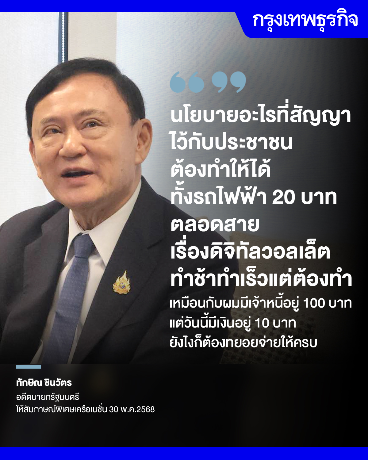 “นโยบายอะไรที่สัญญาไว้กับประชาชนต้องทำให้ได้ ทั้งเรื่องรถไฟฟ้า 20 บาทตลอดสาย เรื่องดิจิทัลวอลเล็ต ทำช้าทำเร็วแต่ต้องทำ เหมือนกับผมมีเจ้าหนี้อยู่ 100 บาท แต่วันนี้มีเงินอยู่ 10 บาทยังไงก็ต้องทยอยจ่ายให้ครบ” นายทักษิณ กล่าว
