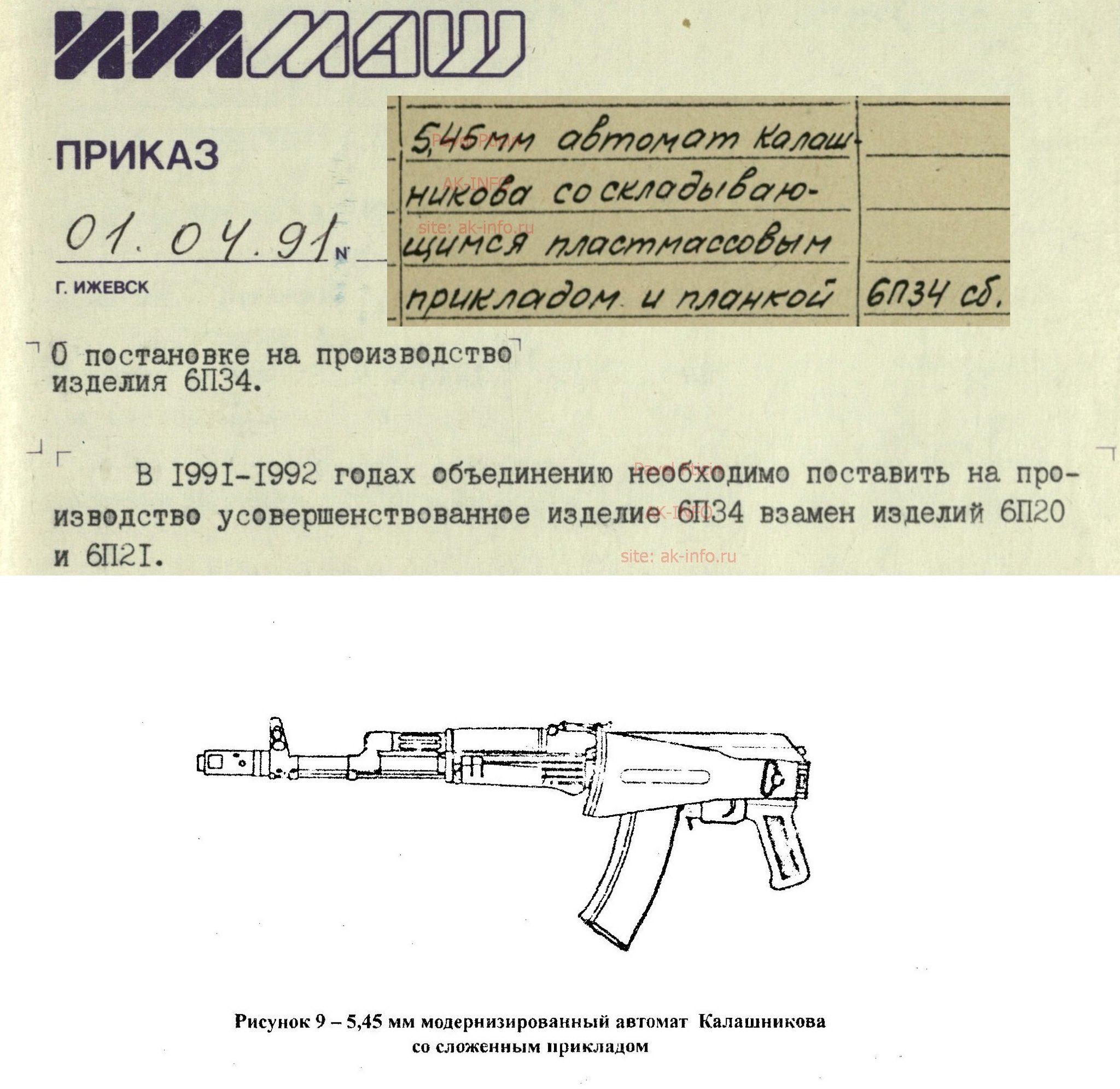 ที่คุณเห็นอยู่นี่คือเอกสารคำสั่งของผู้อำนวยการใหญ่ของโรงงาน Izhmash ให้เตรียมพร้อมสำหรับการผลิตปืนไรเฟิลจู่โจม 6P34 (รหัสประจำการของ AK-74M ในกองทัพรัสเซีย) ในวันที่ 1 เมษายนปี 1991 การผลิตล็อตแรกของ AK-74M เสร็จสิ้นในช่วงปลายปีเดียวกัน-ช่วงต้นปี 1992 ในจำนวน 10,000 กระบอก AK-74M คือปืนไรเฟิลจู่โจมตระกูล AK รุ่นแรกที่มีความเป็นมาตรฐานเดียวกันทั้งหมดในทุกกระบอกที่ผลิตออกมาฟีเจอร์ของมันเหมือนกันหมดนั่นก็คือมีรางสำหรับติดกล้องเล็งที่ด้านข้างซ้ายของตัวปืนและพานท้ายที่สามารถพับเก็บด้านข้างได้ (แต่จะพับเก็บไม่ได้ถ้ามีการติดตั้งกล้องเล็ง) จากที่ก่อนหน้านี้ในสมัยที่ยังเป็นสหภาพโซเวียต AK นั้นมีหลายรุ่นย่อยไม่ได้มีความเป็นมาตรฐานเดียวกันทั้งหมดยกตัวอย่างเช่นถ้าผมพูดชื่อ AKS-74 นั่นหมายถึง AK-74 แบบที่เป็นพานท้ายเหล็กพับทรงสามเหลี่ยมธรรมดาไม่มีรางติดกล้องเล็งที่ด้านซ้ายของตัวปืนแต่ถ้าพูดถึงชื่อ AKS-74N ขึ้นมาตัวนี้แหละที่มีรางสำหรับติดกล้องเล็งเป็นต้น.