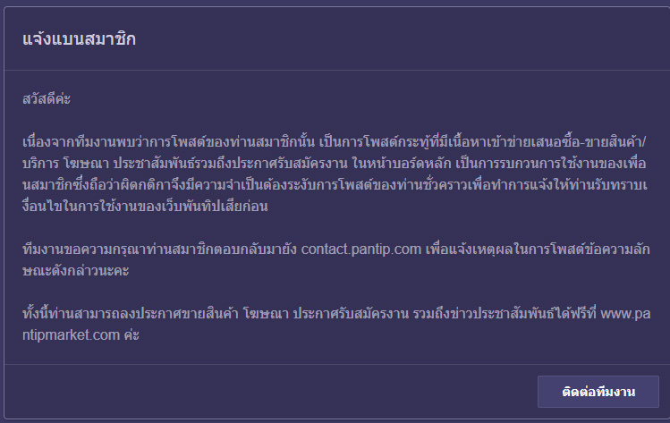 https://pantip.com/topic/43524574 (กระทู้นี้ผมสมัครสมาชิกใหม่แล้วมาตั้งอีกรอบ ผมมั่นใจว่ากระทู้ผมไม่น่าจะผิดกฎ pantip ครับ) ที่โพสในกระทู้เดิมก็มีเนื้อหาในกระทู้แบบเดียวกันเด๊ะๆ ไม่ได้เสนอซื้อขายสินค้า บริการ โฆษณา ประชาสัมพันธ์ ประกาศรับสมัครงานอะไรเลย แล้วหลังจากนั้นในชั่วข้ามคืน กระทู้นี้ก็ถูกลบ และผมก็โดนแบนสมาชิก เลยอยากทราบครับว่าผิดกฎ-กติกาใน pantip ตรงไหนครับ