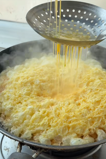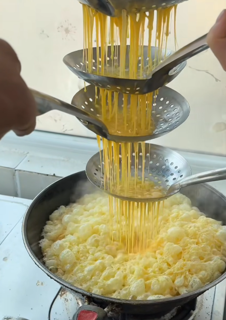 การทำไข่เจียวให้ฟู โดยใช้เทคนิคเทจากที่สูงลงสู่ที่ต่ำผ่านการไหลในช่องรูของกระชอน สาม สี่ชั้น