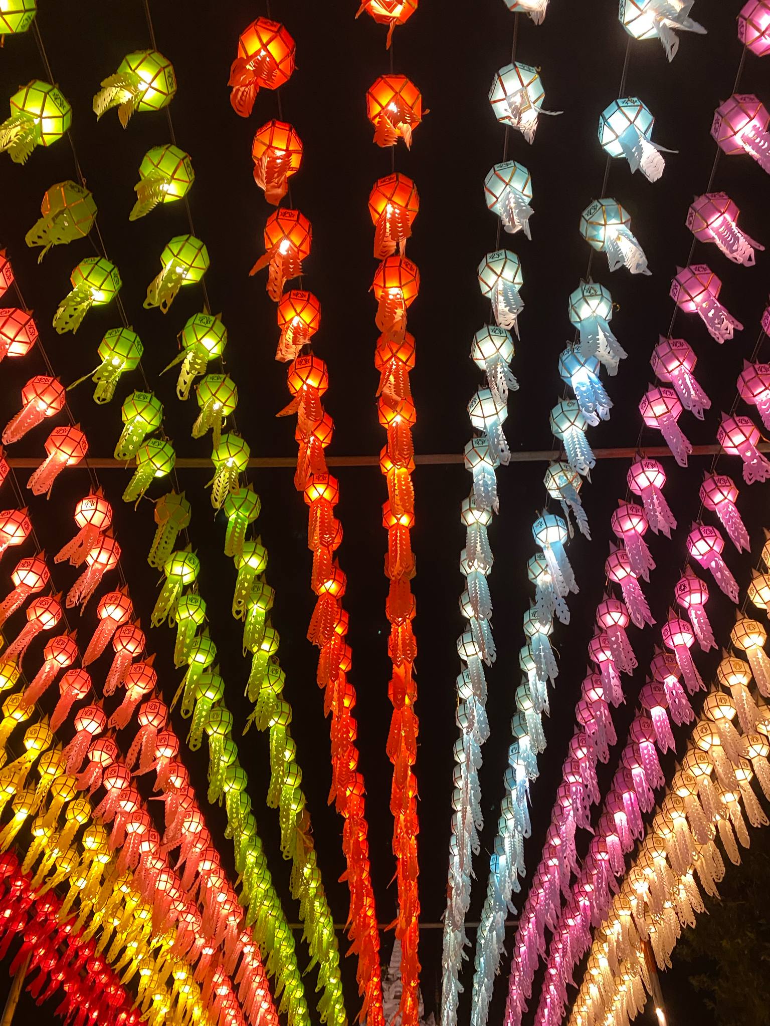 ถัดมาจากวิหาร ก็จะเป็นลานให้แขวนโคมค่ะ แต่ก่อนจะได้โคมมา ต้องบริจาคก่อน ถ้าจำไม่ผิดน่าจะ 99 บาทค่ะ มีสีให้เลือกหลายสีอยู่นะคะ ( ของเราเป็นสีม่วงค่ะ >< ) และพอได้โคมมาแล้วก็เขียนคำอธิษฐานไปแขวนเองได้เลยค่า