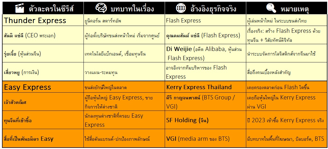 “Easy Express” ในนิยายคือบริษัทขนส่งยักษ์ใหญ่ที่เคยครองตลาดมาก่อน มีเครือข่ายกว้างขวาง และเป็นคู่แข่งสำคัญของบริษัท Thunder Express ซึ่งจากโครงสร้างเรื่อง และเส้นเวลา ทำให้คาดประมาณปีที่เกิดเหตุการณ์น่าจะประมาณช่วงปี 2016–2020 ซึ่งมีความคล้ายกับบริษัท : 👉 Kerry Express Thailand (เคอรี่ เอ็กซ์เพรส) 👈 เป็นเบอร์ 1 ในตลาดขนส่งพัสดุด่วนไทย มีภาพลักษณ์ “มืออาชีพ–ระบบแน่น” เหมือน Easy Express และที่สำคัญคือ...