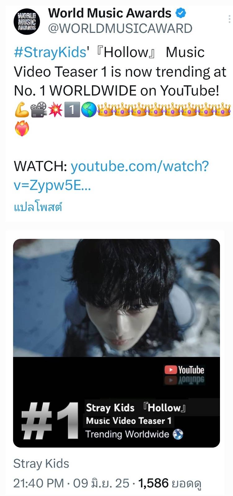🔥 Stray Kids “Hollow” ตัวอย่างมิวสิควิดีโอ 1 กำลังติดเทรนด์อันดับ 1 ของโลกบน YouTube