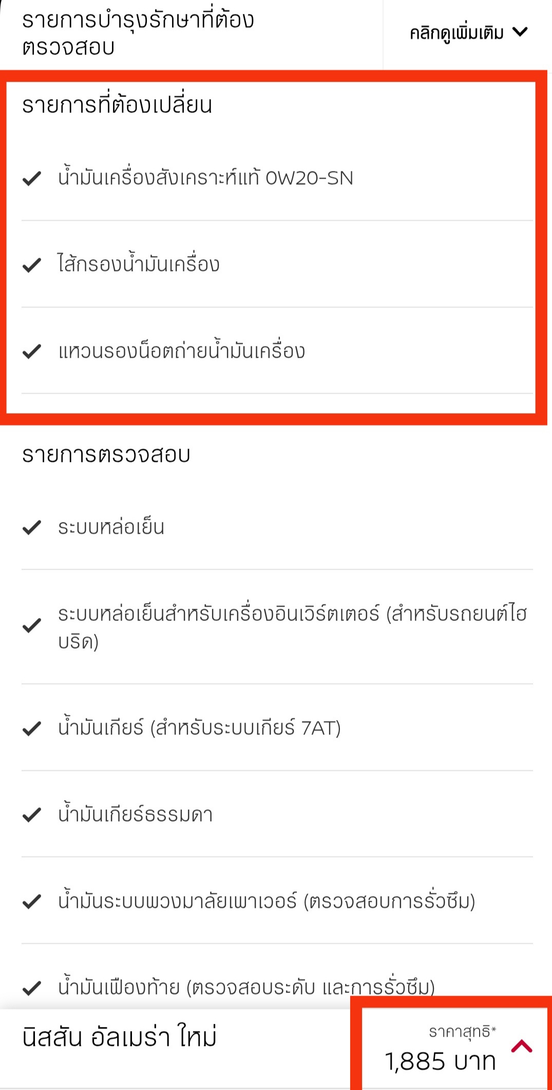 ในรอบนี้มีรายการตรวจตามรอบทั่วไป และรายการถ่ายน้ำมันเครื่อง ราคา 1,885 บาท(ราคากลางในเวป)