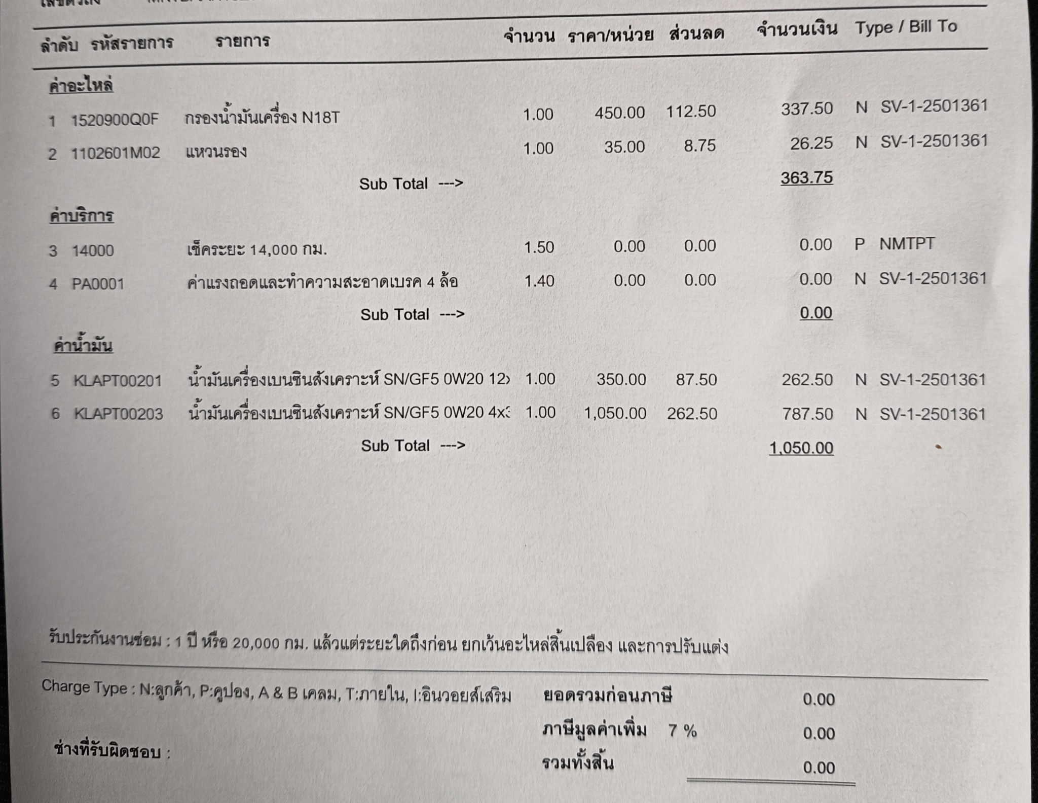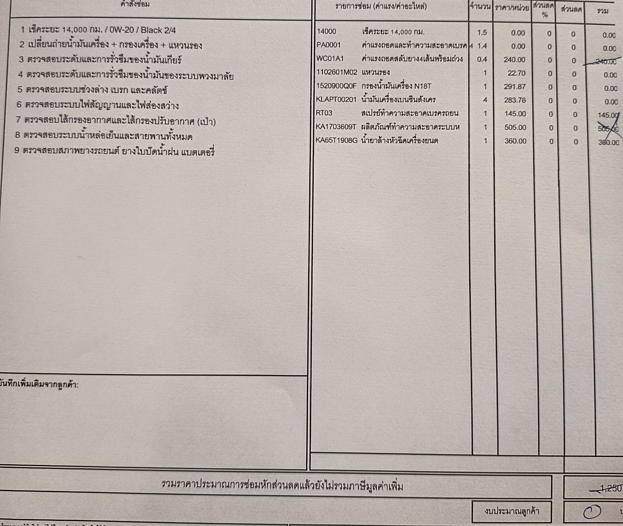 ในรายการถ่ายน้ำมันเครื่องเป็น 0.00 เพราะผมได้ซื้อแพคเกจถ่ายน้ำมันเครื่องไว้แล้ว