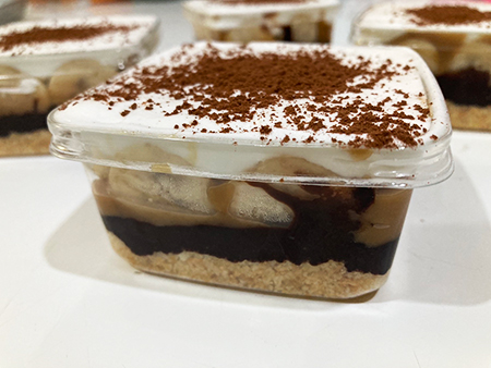 ส่วนผสมประกอบด้วย ... แครกเกอร์ทุบป่นละเอียดคลุกเคล้าด้วยเนยเค็ม กล้วยหอมสุกพอดีๆ ราดด้วยดาร์คช็อคโกแลต คาราเมล วิปครีมนมสด ผงโกโก้โรยหน้าพองาม