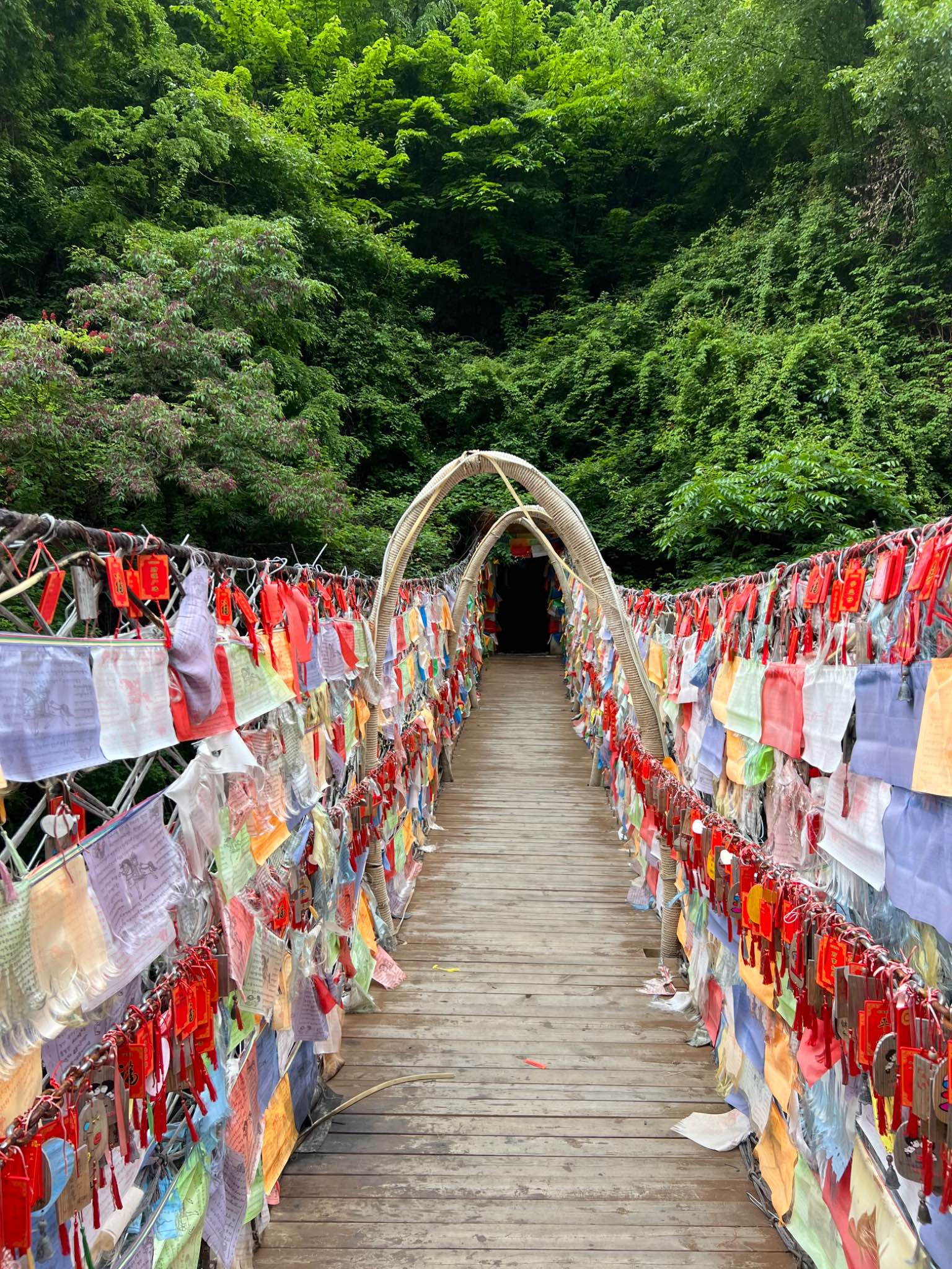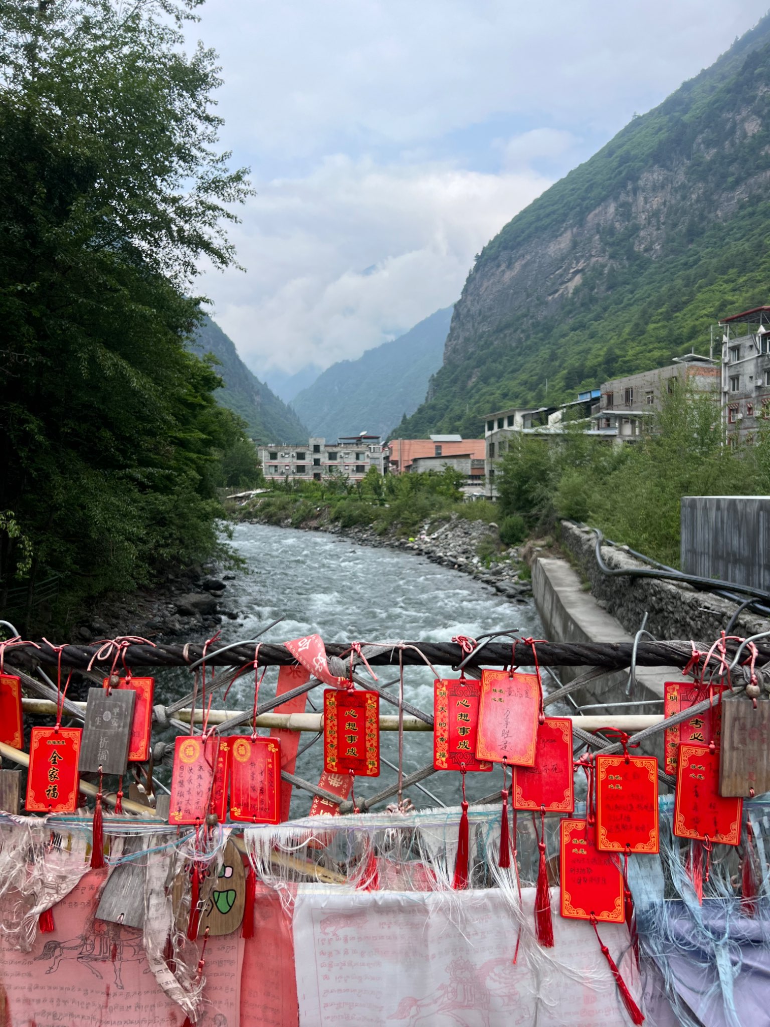 ตื่นเช้ามาเห็นโรงแรมวิวสวยมาก มีสะพานไม้พาดผ่านลำธาร มีการผูกผ้าสีไว้ตลอดทางไปทางเขา ผมแอบเเข้ข้ามไปดูครับ แต่ไม่มีอะไร