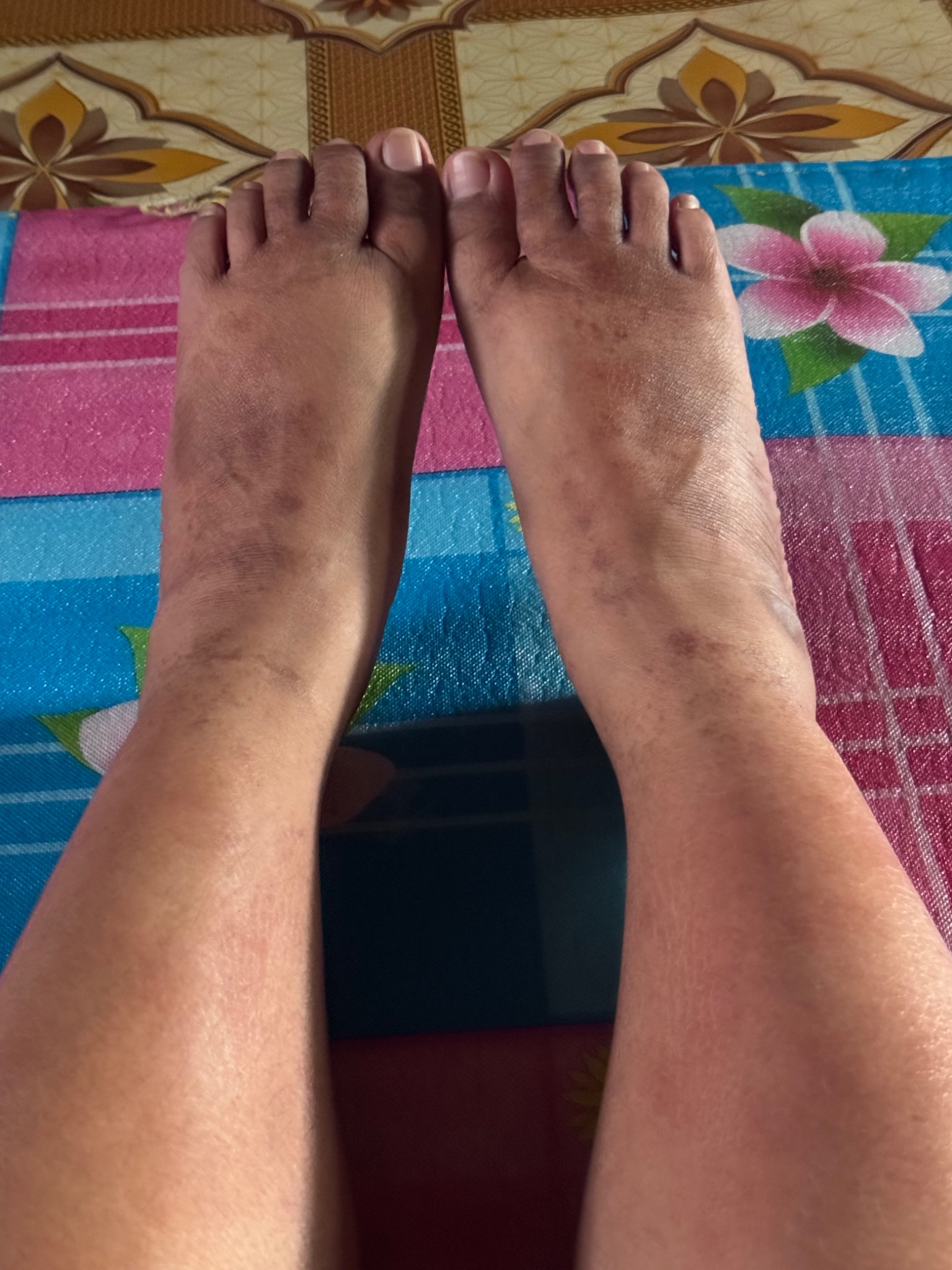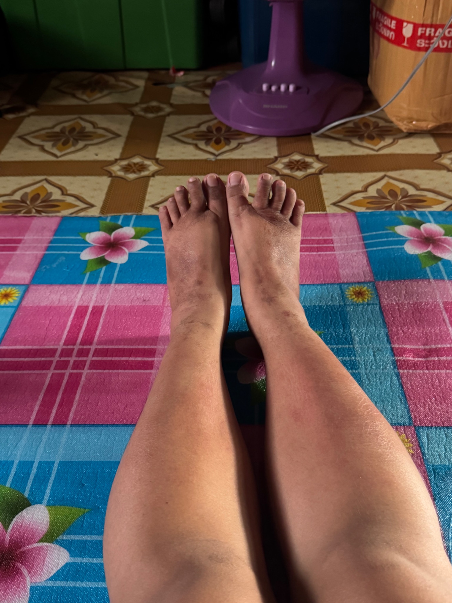 เท้าเหมือนรอยไหม้ค่ะ ไม่มีอาการเจ็บเลย ไม่รู้เป็นตอนไหนไม่รู้สึกตัวเลยค่ะ รู้อีกทีก็มีรอยแล้ว ไปหาหมอที่โรงพยาบาลหมอก็ไม่มั่นใจว่าเกิดจากอะไร เพราะ มันมีอาการอักเสบหรือเป็นไตข้างในหมอเลยเอาเนื้อไปตรวจ