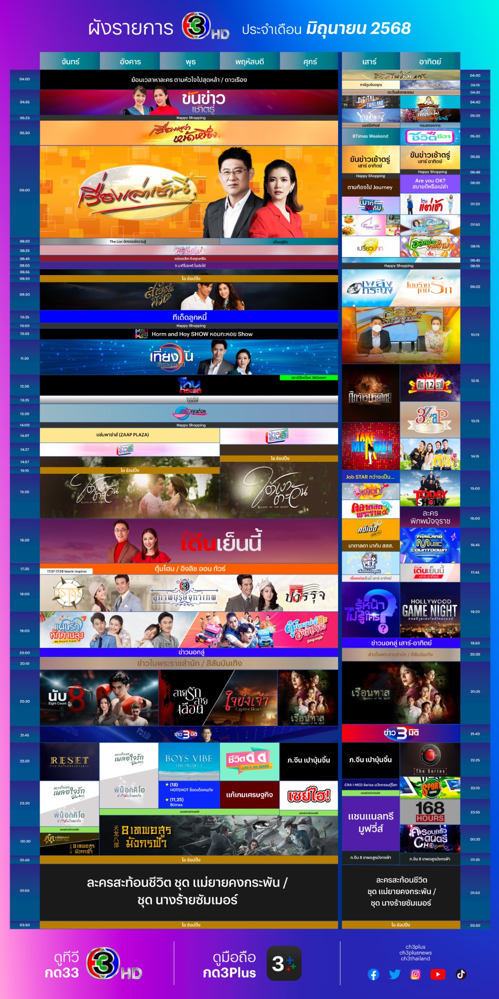 ผังรายการช่อง 3 ประจำเดือนมิถุนายน 2568
