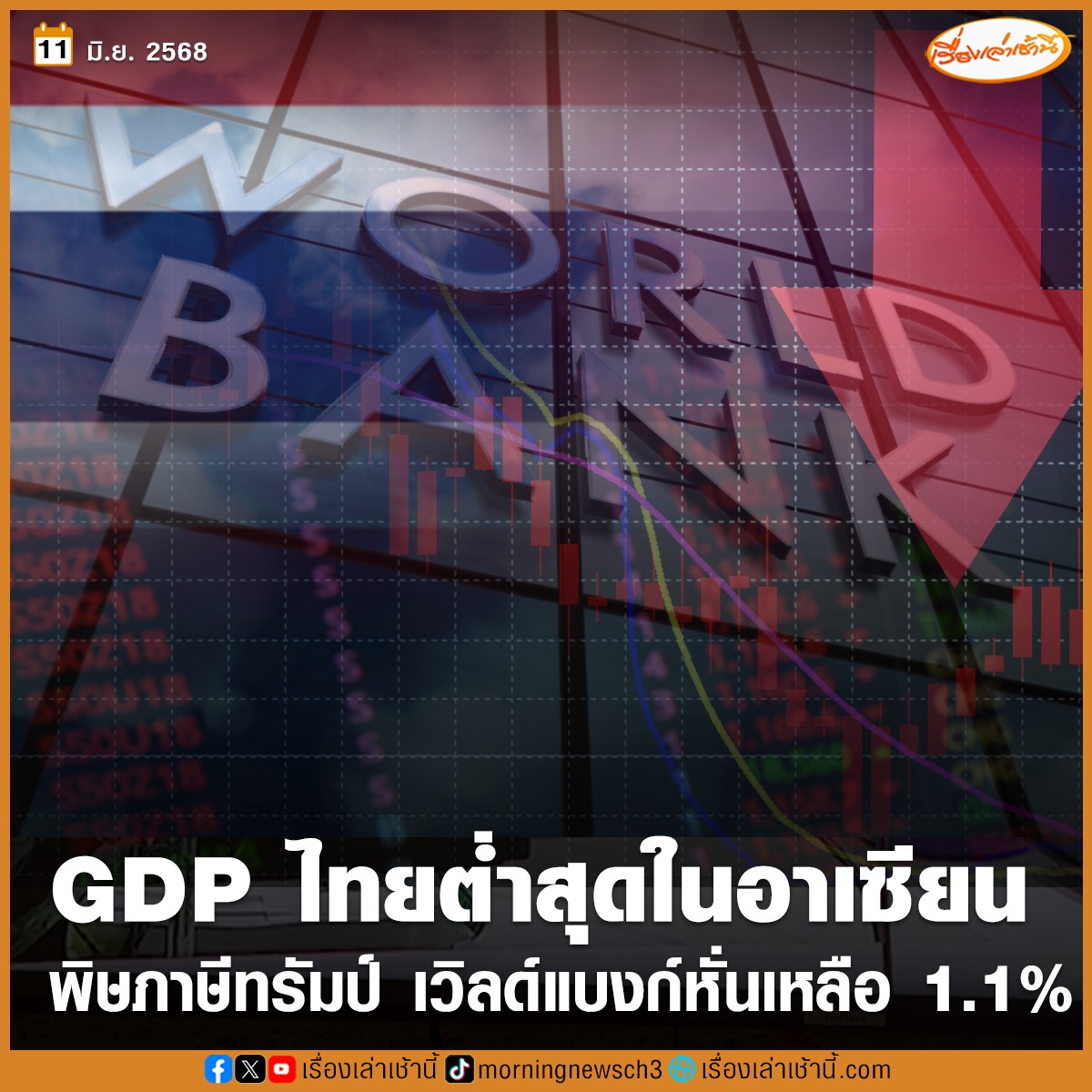 ธนาคารโลก ยังได้ปรับลดคาดการณ์การเติบโตทางเศรษฐกิจของประเทศไทยในปีนี้ ลงเหลือ 1.1% จากที่คาดว่าจะเติบโตที่ 1.8% ซึ่งเป็นอัตราการเติบโตต่ำสุดในอาเซียน จากแนวโน้มเศรษฐกิจที่อ่อนแอลง ท่ามกลางความไม่แน่นอนทั่วโลก และกิจกรรมทางเศรษฐกิจได้รับผลกระทบจากภัยธรรมชาติ เช่น แผ่นดินไหว