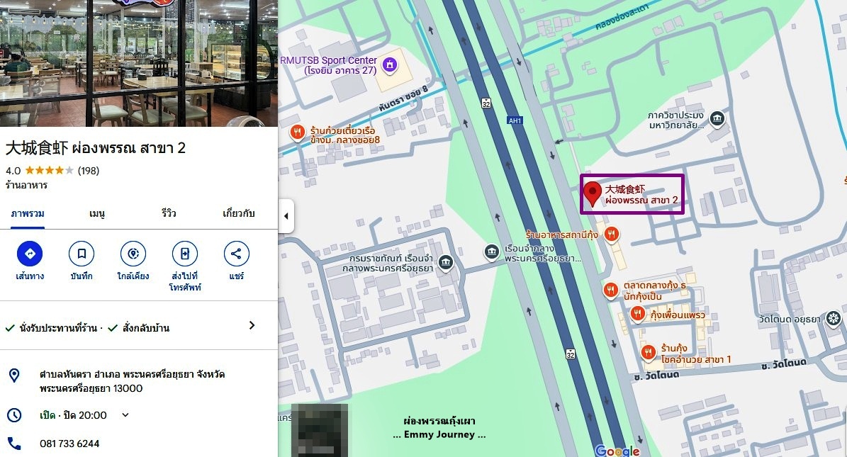 ผ่องพรรณกุ้งเผา, ผ่องพรรณกุ้งเผา สาขา 2, ร้านกุ้งเผา, ตลาดราชมงคล, ตำบลหันตรา, อยุธยา, พระนครศรีอยุธยา, จังหวัดพระนครศรีอยุธยา