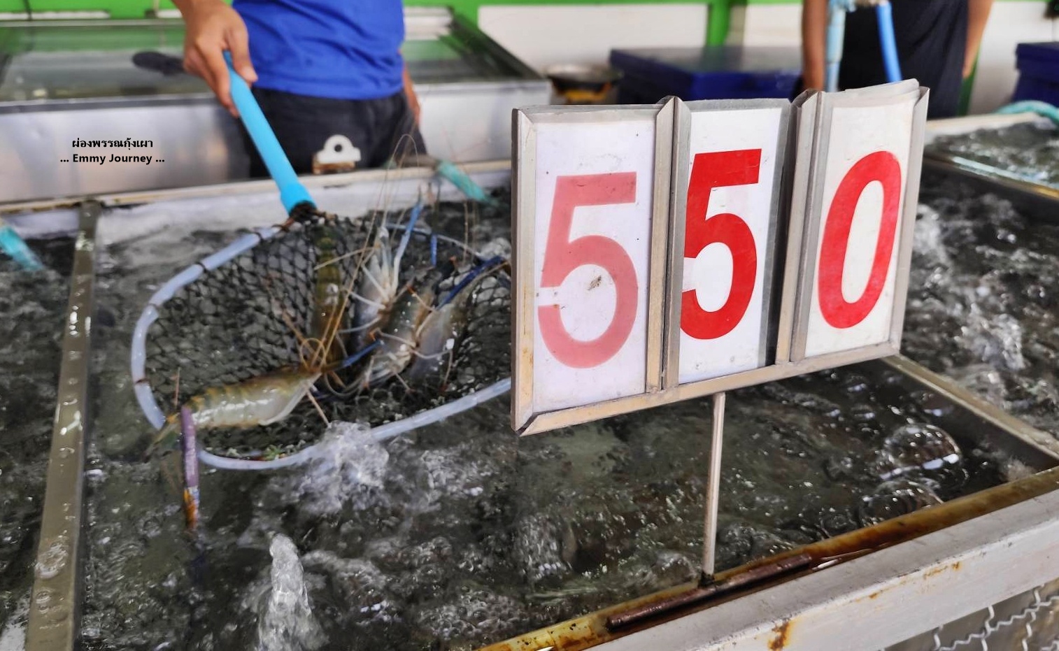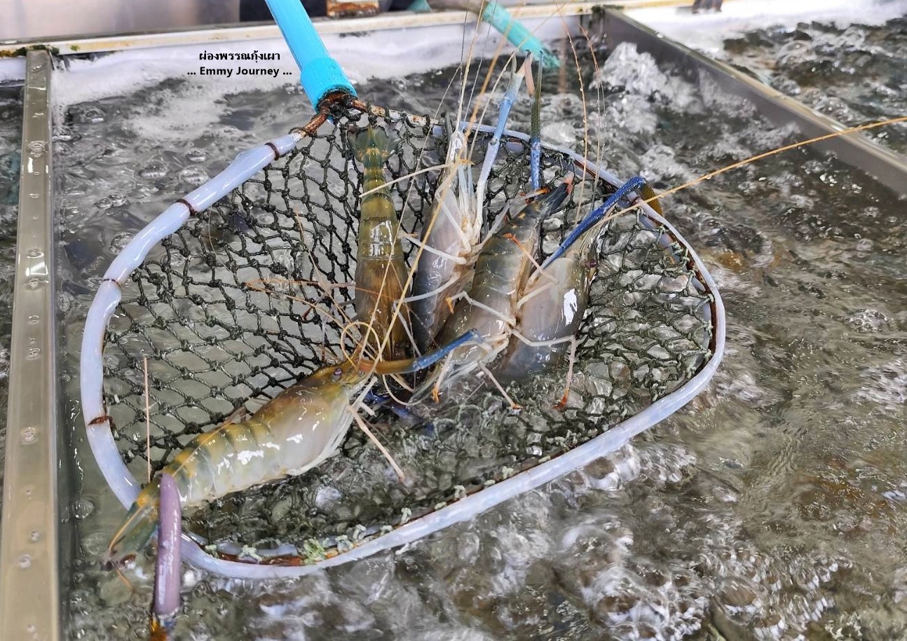 หน้าร้านมีกุ้งเป็นๆ ให้เลือกหลายไซส์ หลายราคาตามใจชอบ