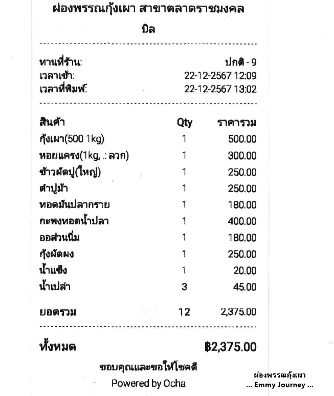 มื้อนี้จ่ายไป 2,375 บาท (ราคาอาหาร ณ วันที่ 22 ธันวาคม 2567)