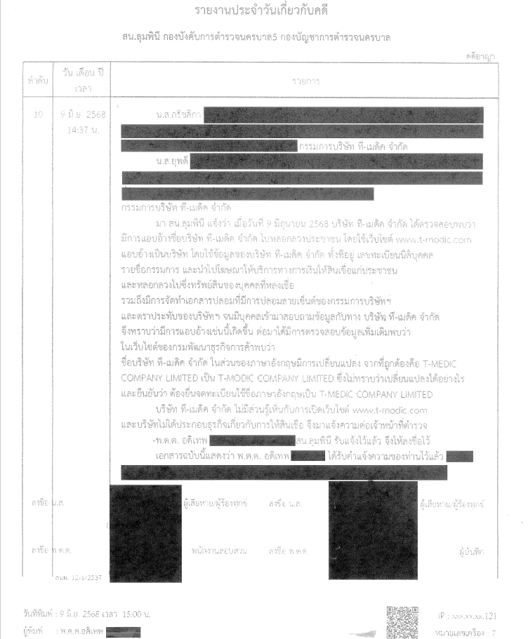 ในนามผู้บริหารบริษัท T Medic จำกัด ขอแจ้งยืนยันว่าบริษัทมิได้เปิดทำการปล่อยกู้เงินหรือสินเชื่อใดๆ และมิได้มีส่วนเกี่ยวข้องในการทำธุรกรรมต่างๆ ทางบริษัทตกเป็นผู้เสียหายจากการนำข้อมูลของบริษัท ที่อยู่ เบอร์โทร เลขประจำตัวผู้เสียภาษี และรายละเอียดต่างๆไปใช้ในทางมิชอบ มีการปลอมแปลงเอกสาร และปลอมแปลงลายเซ็นต์ ทั้งนี้บริษัทได้แจ้งความเพื่อลงบันทึกประจำวันที่สถานีตำรวจลุมพินีแล้วเมื่อวันที่ 10 มิถุนายน2568 จึงเรียนมาเพื่อโปรดทราบ