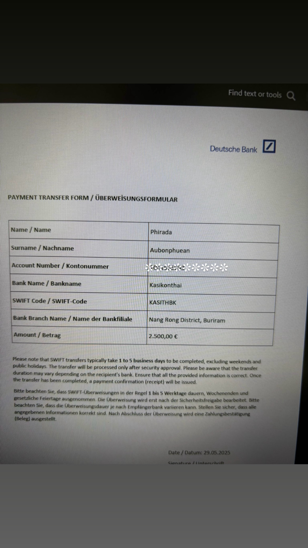 เป็นการโอนผ่านธนาคาร ดอยซ์เเบงค์ของเยอรมันโอนแบบสวิตโค้ด ค่ะ
