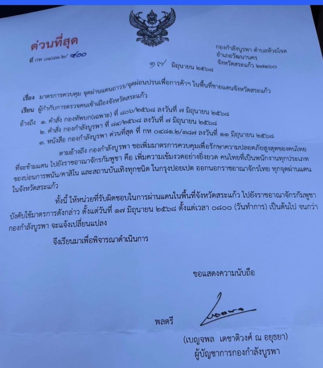 กองกำลังบูรพาออกมาตรการ ห้ามคนไทยเข้าไปทำงานที่คาสิโนและสถานบันเทิงทุกชนิด ในฝั่งกัมพูชา