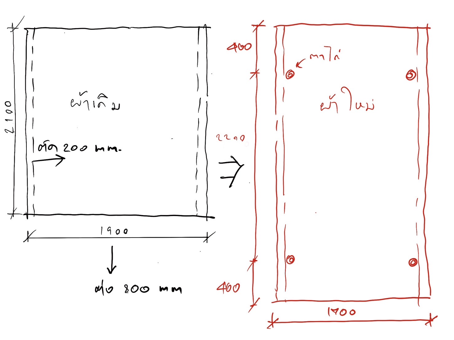 มองหาร้านตัดเย็บแก้ผ้าครับ อยากแก้จากขนาด 2100 x 1900 มม. เป็น 2200 x 1700 มม. ตามในรูปที่ 1 ครับ เป็นผ้าอะไรก็ได้ครับ ที่พอกันฝนได้ครับ