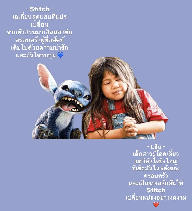 ตอนแรก Stitch มีนิสัยดุร้ายและทำลายล้าง แต่ Lilo สอนให้เรียนรู้ถึงความรักและความหมายของคำว่า โอฮานา (Ohana) ที่แปลว่า ครอบครัว และไม่มีใครถูกทิ้งไว้ข้างหลัง