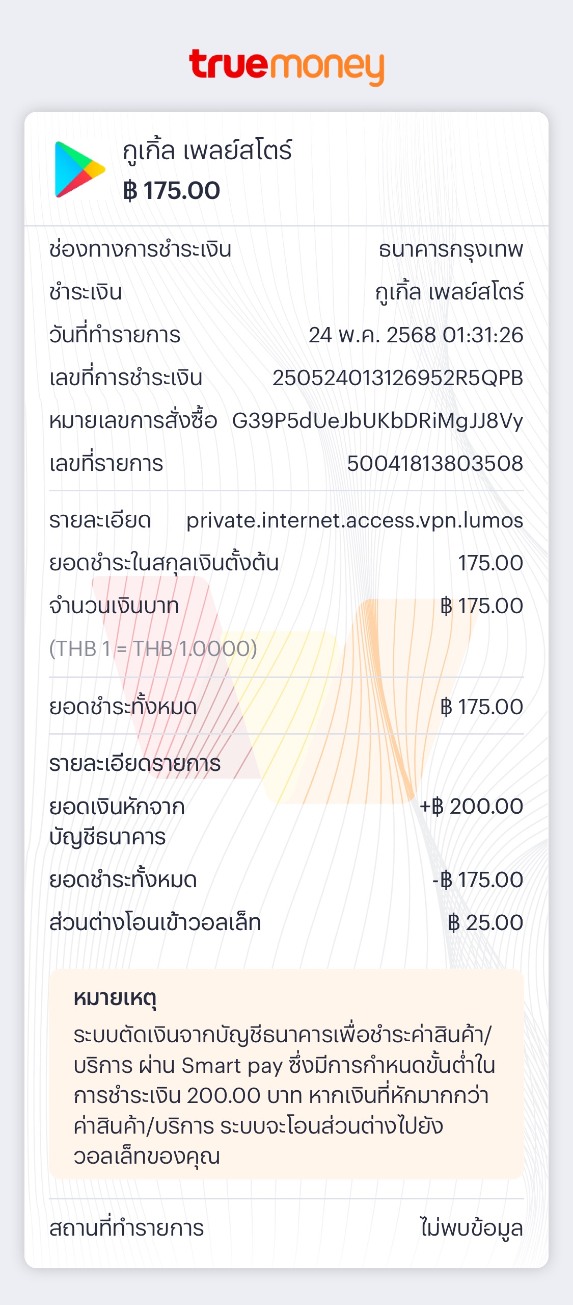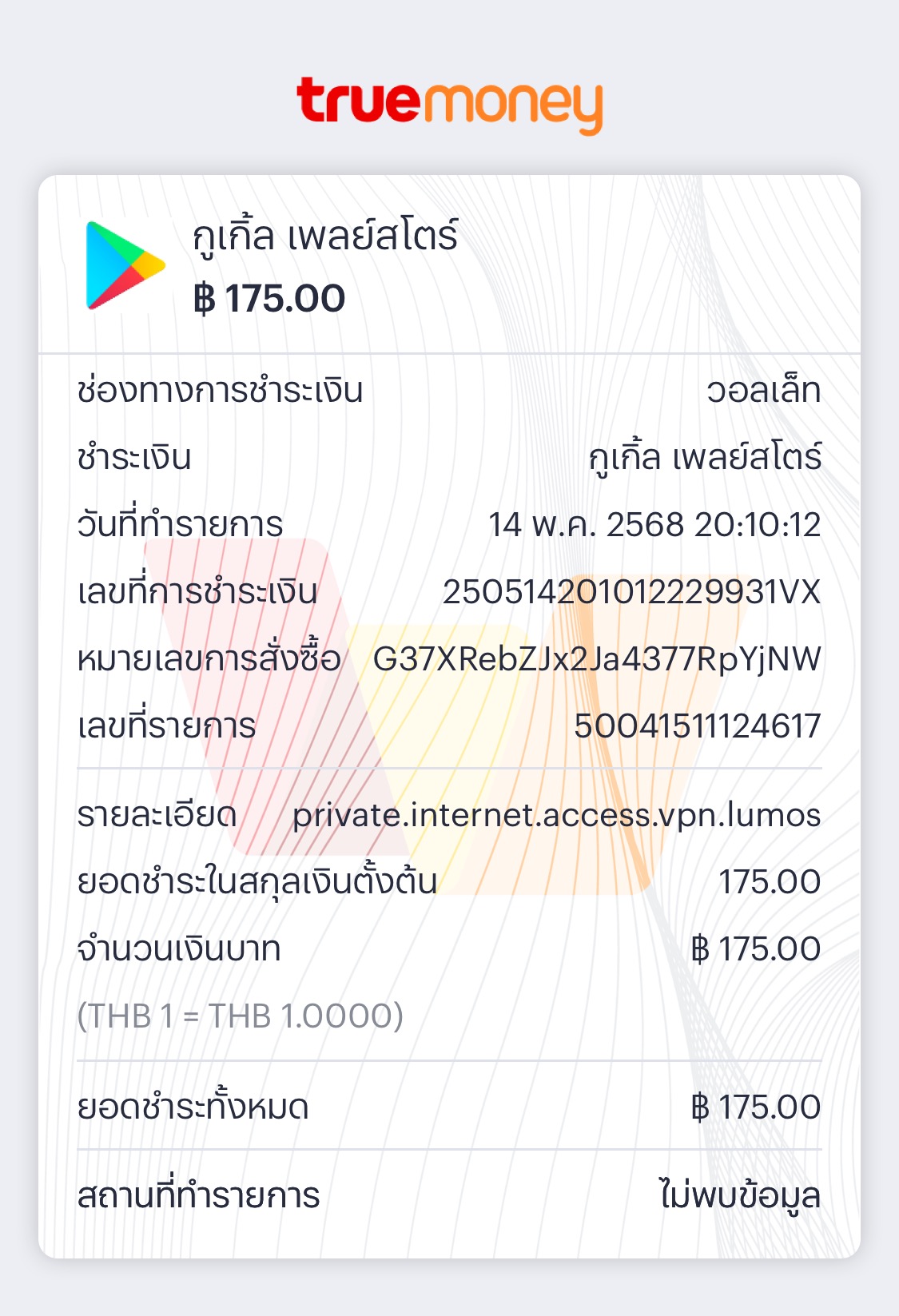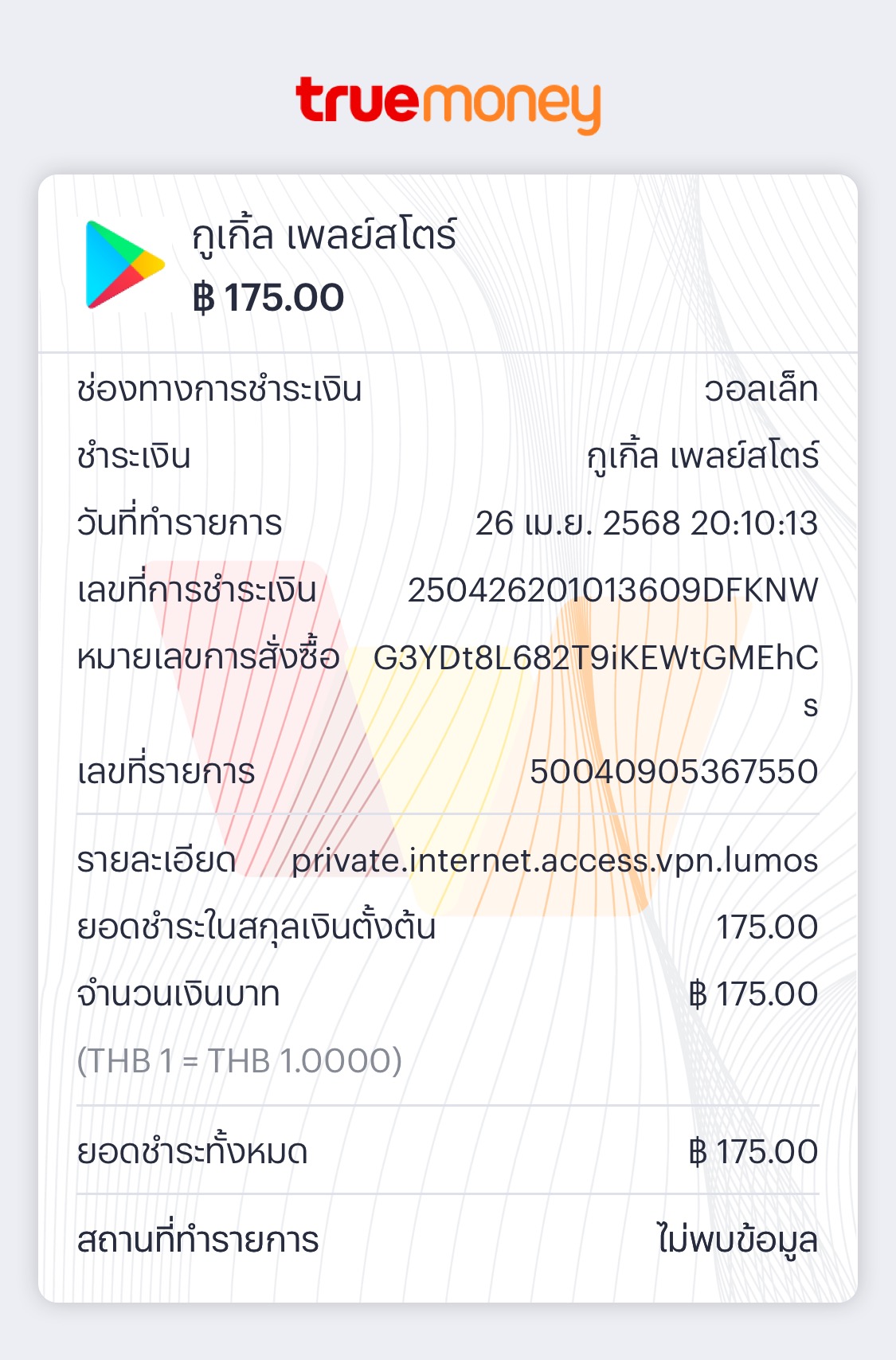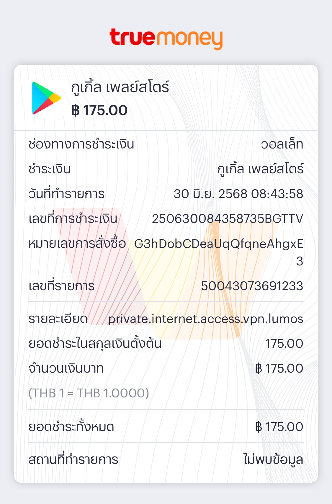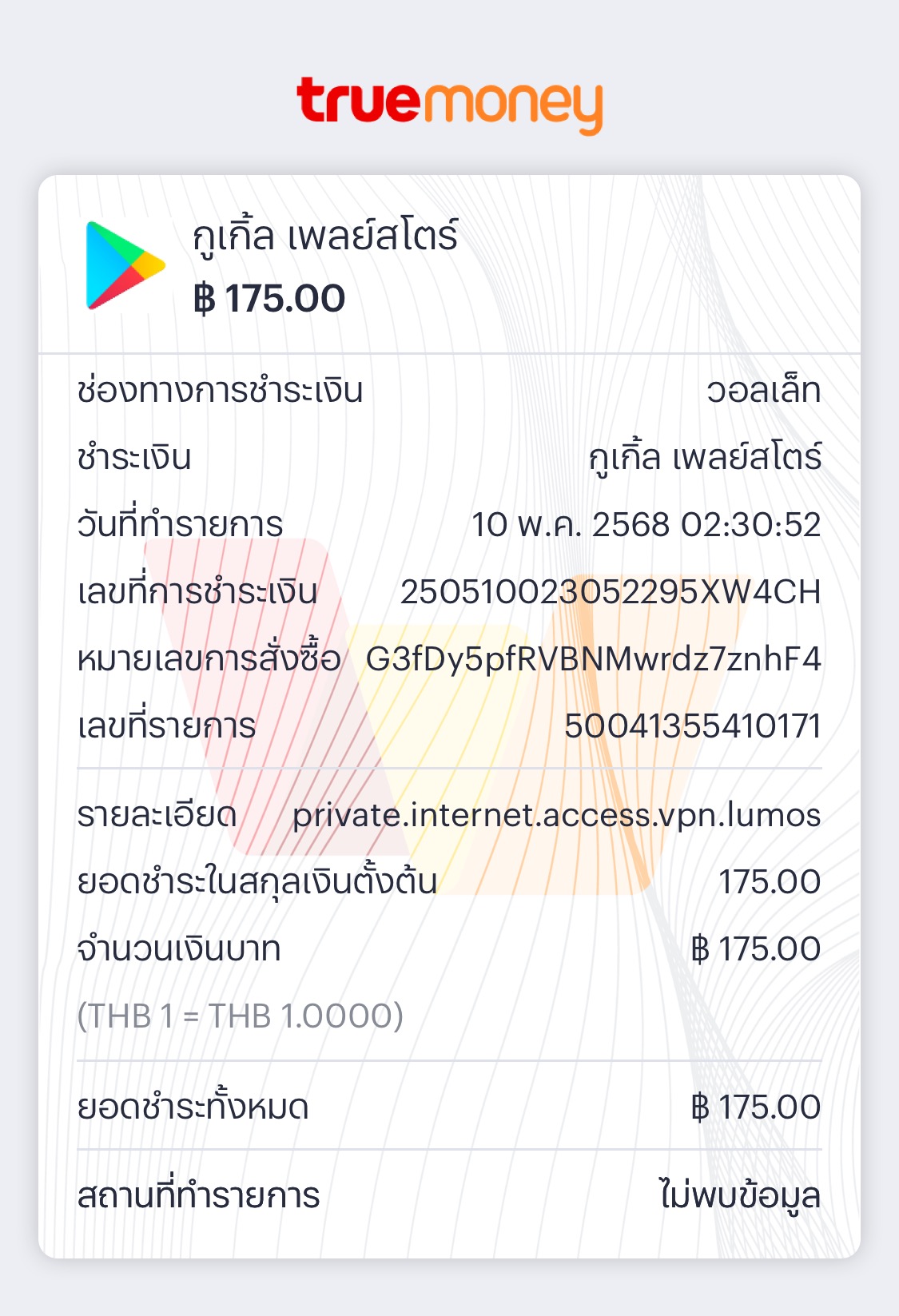 เราโดนหักเงินมาตลอดทุกครั้งที่มีเงินคงเหลืออยู่ในแอพ True money เกิน 150฿ เค้าพยายามติดต่อทุกทางที่จะขอเงินคืนจากการโดนหักไปเเบบที่ไม่รู้ตัว ตอนนี้เค้าก็ยังหาสาเหตุไม่ได้ จากในใบเสร็จจากแอพเป็น vpn หักโดยกูเกิ้ลเพล์สโตร์ พอทราบข้อมูลเบื้องต้นว่ามันคืออินเทอร์เน็ตบางอย่าง