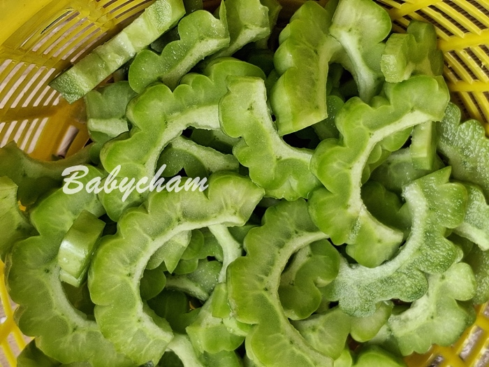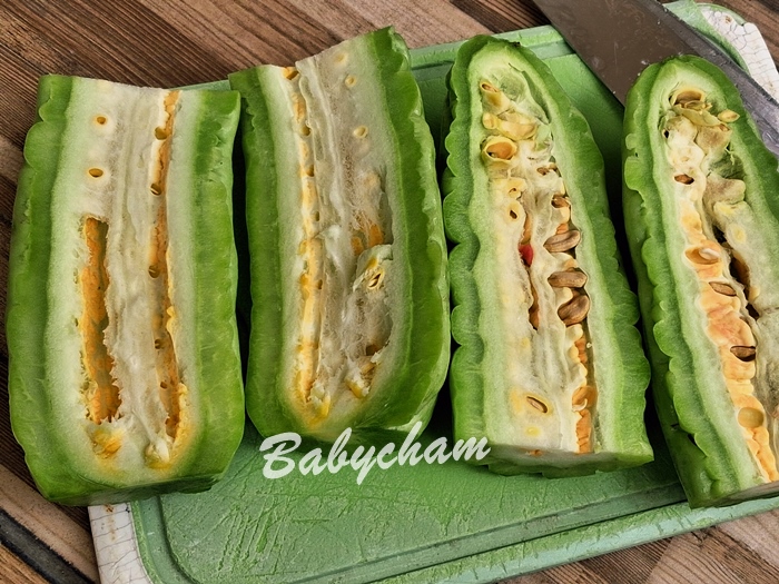ซื้อมะระมา 1 ลูก เมื่อ 2 วันก่อน แล้วจับแช่ตู้เย็นไว้ วันนี้เลยนำมาผ่าครึ่ง คว้านไส้และเมล็ดออก ใช้ช้อนสั้นขูดเยื่อขาวๆ ออกให้มากที่สุด