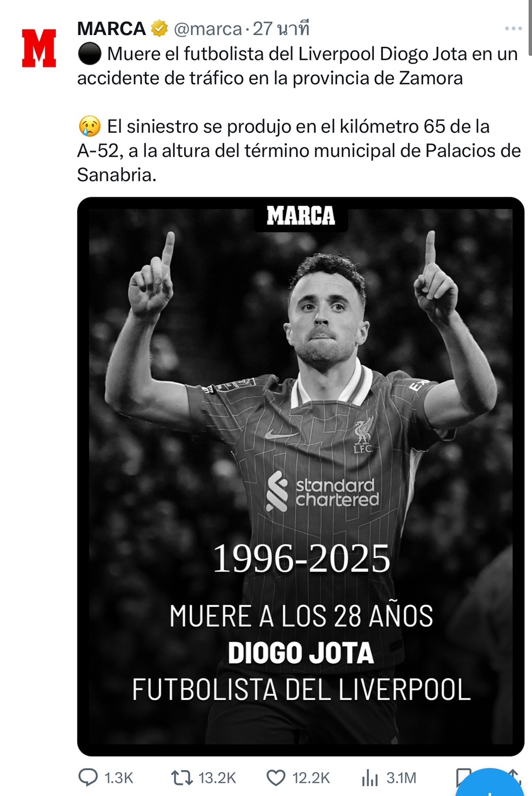 Breaking News ดิโอโก้ โจต้า นักเตะกองหน้าลิเวอร์พูล ประสบอุบัติเหตุเสียชีวิต