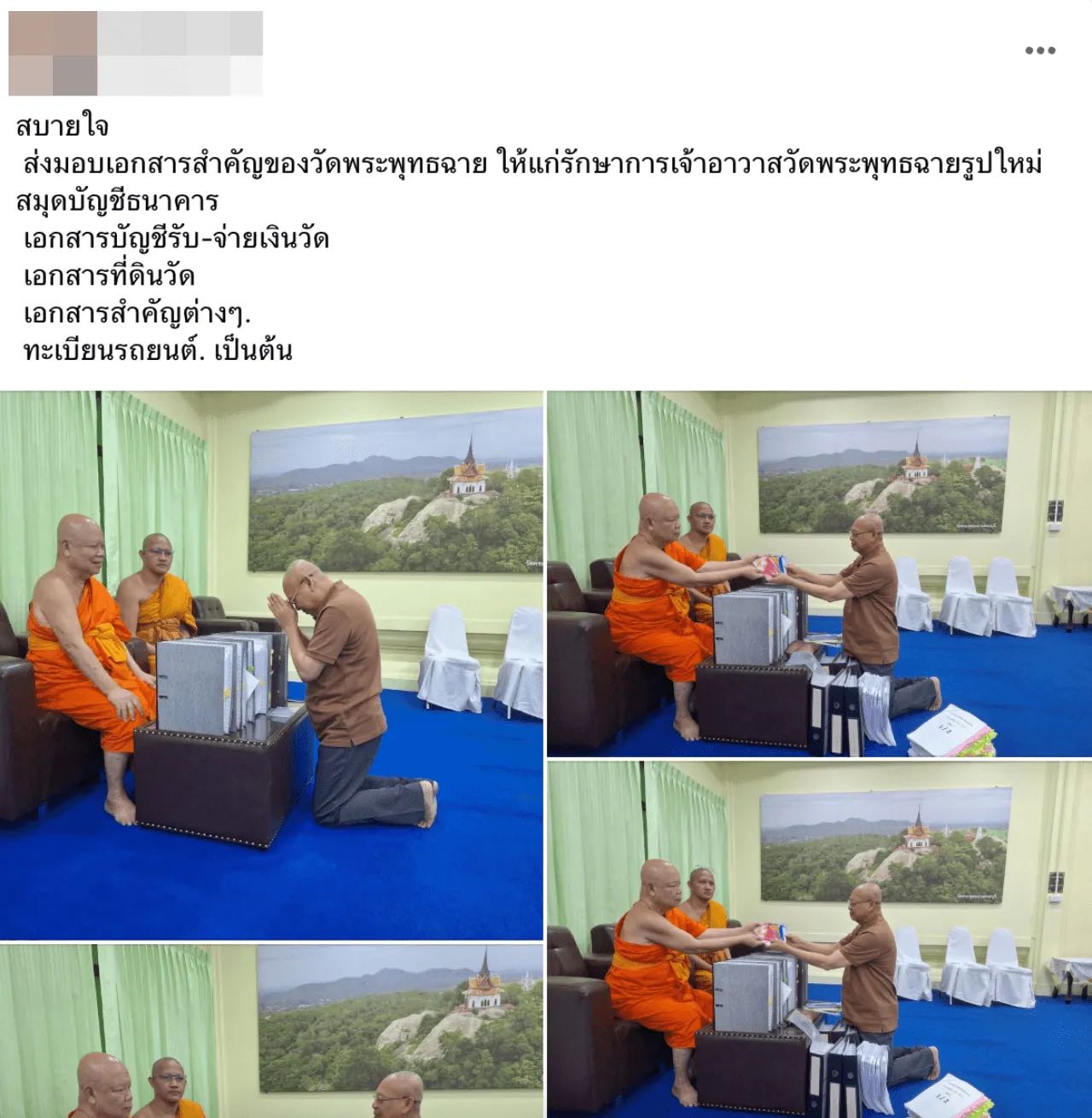 ได้โพสต์ภาพพร้อมข้อความผ่านเฟซบุ๊กส่วนตัว โดยระบุว่า "สบายใจ ส่งมอบเอกสารสำคัญของวัดพระพุทธฉายให้แก่รักษาการเจ้าอาวาสวัดพระพุทธฉายรูปใหม่ สมุดบัญชีธนาคาร เอกสารบัญชีรับ-จ่ายเงินวัด เอกสารที่ดินวัด เอกสารสำคัญต่างๆ ทะเบียนรถยนต์ เป็นต้น"