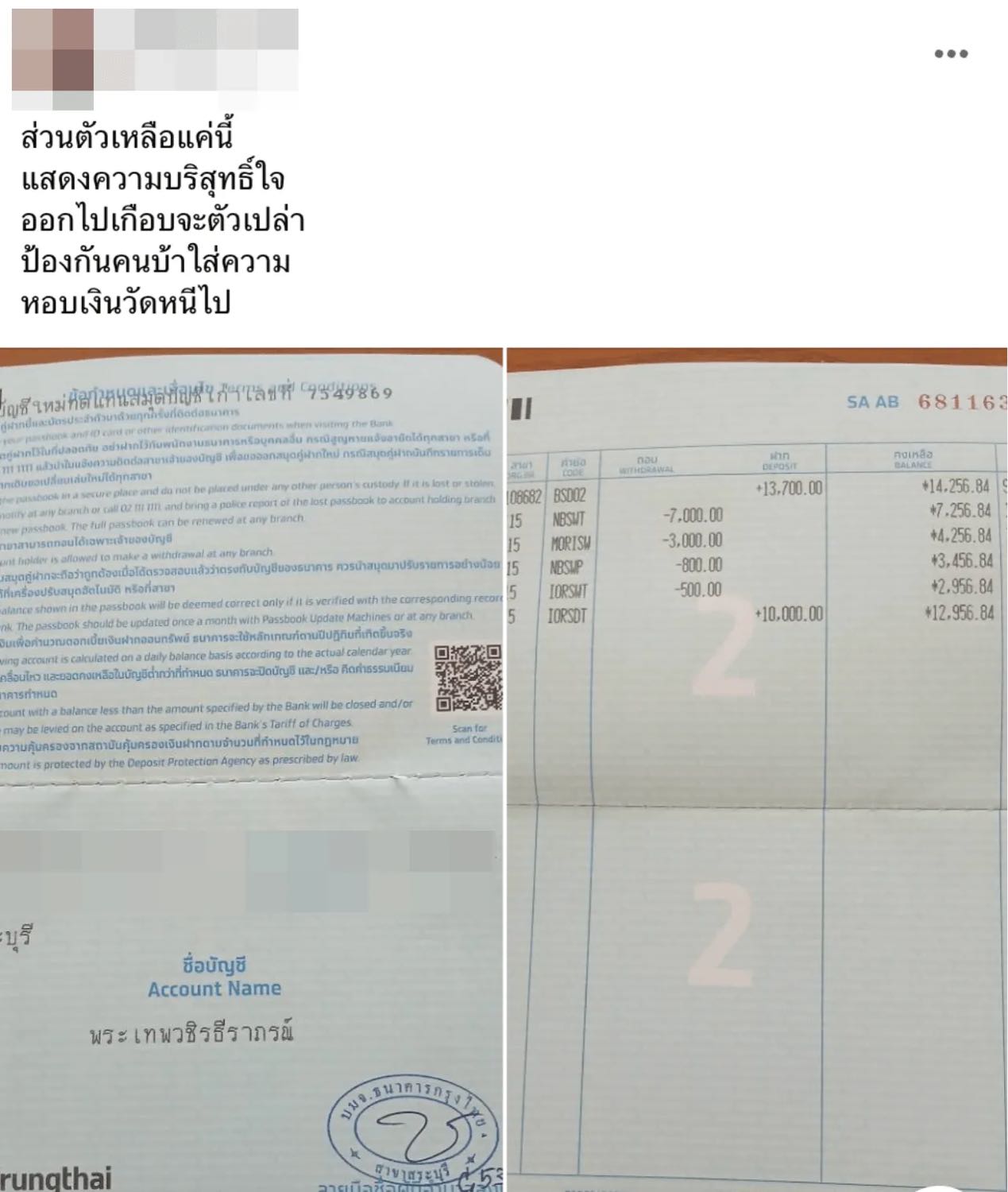 ต่อมายังได้โพสต์ "ภาพสมุดบัญชีธนาคารส่วนตัว" พร้อมให้เห็นยอดเงินคงเหลือ โดยระบุว่า "ส่วนตัวเหลือแค่นี้ แสดงความบริสุทธิ์ใจ ออกไปเกือบจะตัวเปล่า ป้องกันคนบ้าใส่ความหอบเงินวัดหนีไป"