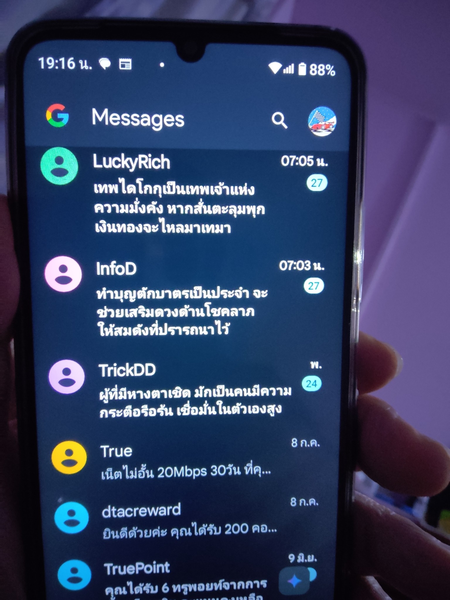 วันนี้วันที่ 17/07/68 เราเข้าไปเช็คยอดเงินในมือถือ หลังจากที่ไม่ได้ใช้มาตั้งแต่ประมาณวันที่ 7-8 เดือนมิถุนายน ปรากฏว่าเงินหายไป ประมาณ 500บาท แล้วก็มีข้อความส่งเข้ามาในเครื่องจำนวนมาก นึกในใจกูโดนแล้ว เลยรีบไปกด *137 ยกเลิกข้อความทั้งแบบเก็บเงินและทั้งหมด แล้วไปศูนย์บริการทรู พนักงานแจ้งว่า ไอ้บริการที่เก็บเงินนั้นน่ะมาจากเวปที่เราเข้าไป พนักงานจะทำการลบประวัติการเข้าทั้งหมด เราก็อนุญาต แต่ไม่สามารถคืนเงินได้ เนื่องจากเป็นระบบเติมเงิน เราไม่อยากเถียงกับ พนง เลยกลับบ้าน ลงทะเบียนแจ้ง สคบ เรียบร้อยละ