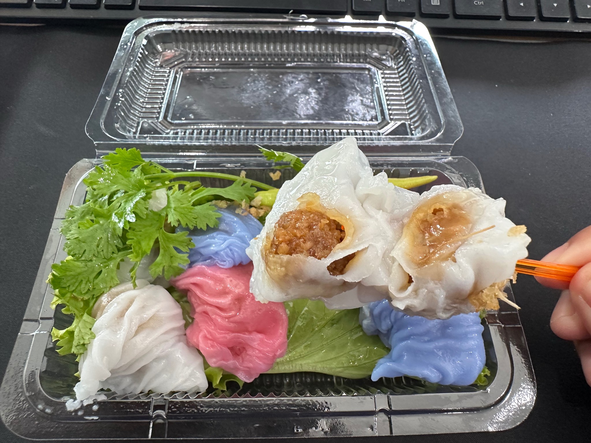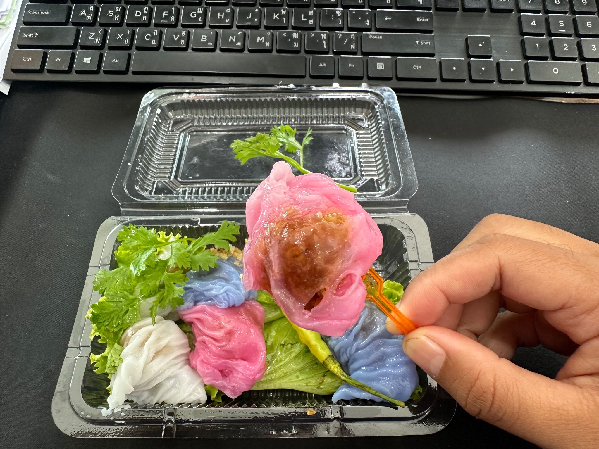 มีทั้งสีชมพู ฟ้า ขาว แต่ละชิ้นคือห่อไส้หวานมาแน่น ๆ แป้งบางเหนียวนุ่ม ห่อมาพอดีคำ