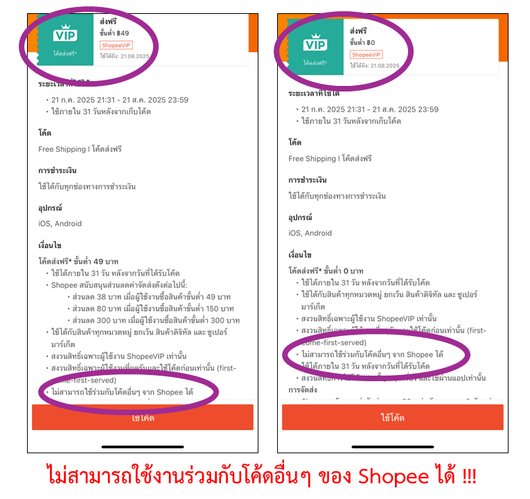 โค้ด VIP ส่งฟรี ที่ได้มาทั้ง 50 ใบ ไม่สามารถใช้ร่วมกับโค้ดอื่นๆได้ครับ