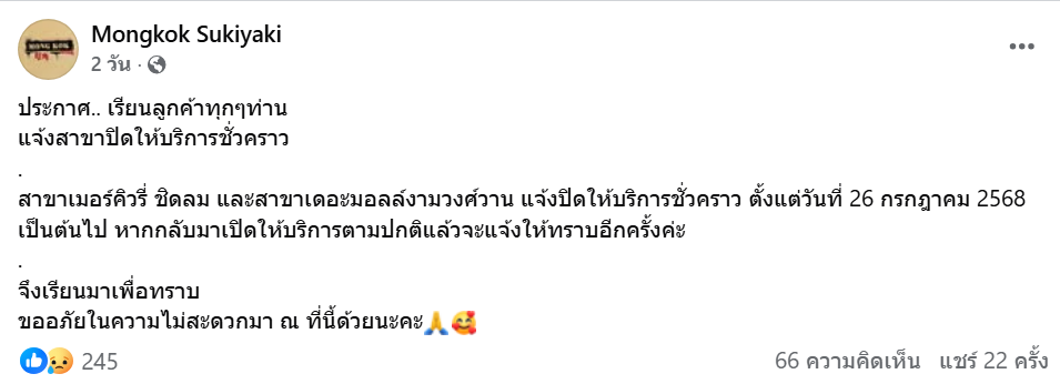 Mongkok Sukiyaki แจ้งสาขาปิดให้บริการชั่วคราว