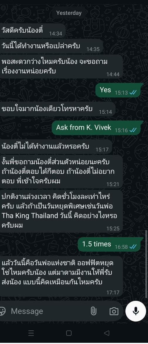 เรื่องมันเกิดจากพี่คนขับรถเขามาทำงานวันหยุดค่ะ มาทำวันที่28/07/2025 พี่เขาทักมาเนื่องจากคิดว่าเรามาทำงานเเล้วสิ่งที่นายตอบคือ 1.5 พอเรากลับมาทำงานเรามาจะเอามือถือออฟฟิศมาเช็คว่ามีใครโทรมาไหมเลยมานายรีบเเจ้งเลยว่าไม่ต้องตอบนะผมตอบเเล้ว....เเบบนี้นายรู้เเต่ไม่ยอมจ่ายใช่ไหมค่ะควรทำอย่างไรดีค่ะหนูรู้สึกไม่โอเคเเทนพี่