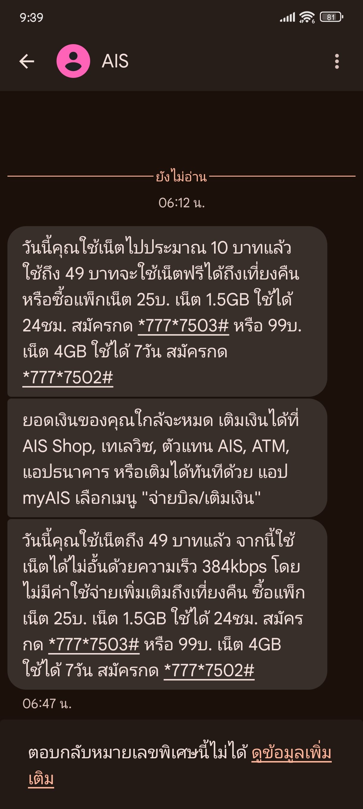 คืออะไรแดกเงินกูเก่งมากบ่อยมาก วันนี้ยังไม่ได้เปิดใช้ข้อมูลมือถือเลยแม้แต่นิดเดียวแต่แดกเงินกูฉ่ำ ปัญหาเดิมๆที่ระบบ AIS มักจะกินเงินมือถือโดยผู้ใช้ไม่รู้ตัว เป็นแบบนี้ประจำ น่าเบื่อสุดๆ ถามหาความรับผิดชอบไม่เคยได้ ทำได้แค่มาแนะนำให้ปิดระบบเน็ตจากมือถือเอง อย่ามาถามคำถามโง่ๆกลับนะ ถ้าเปิดเน็ตใช้จริงคงไม่มาวันหรอก แล้วเกิดแต่กะกูเนี่ยเรื่องแดกเงินมือถือเนี่ย