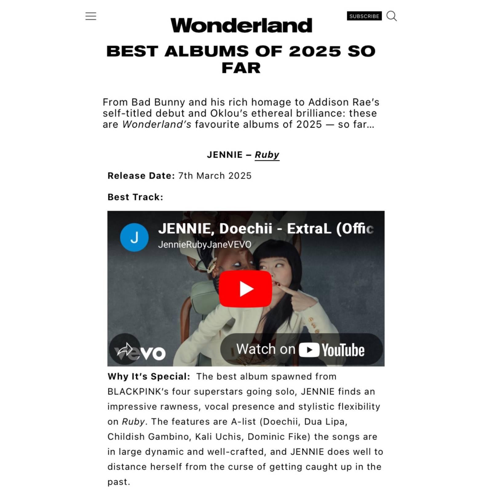 นิตยสาร Wonderland ของสหราชอาณาจักรยกให้อัลบั้ม RUBY ของเจนนี่เป็นหนึ่งในอัลบั้มที่ดีที่สุดของปี 2025 ซึ่งเป็นอัลบั้มเดียวจากศิลปินเคป๊อปที่ติดอยู่ในรายชื่อนี้